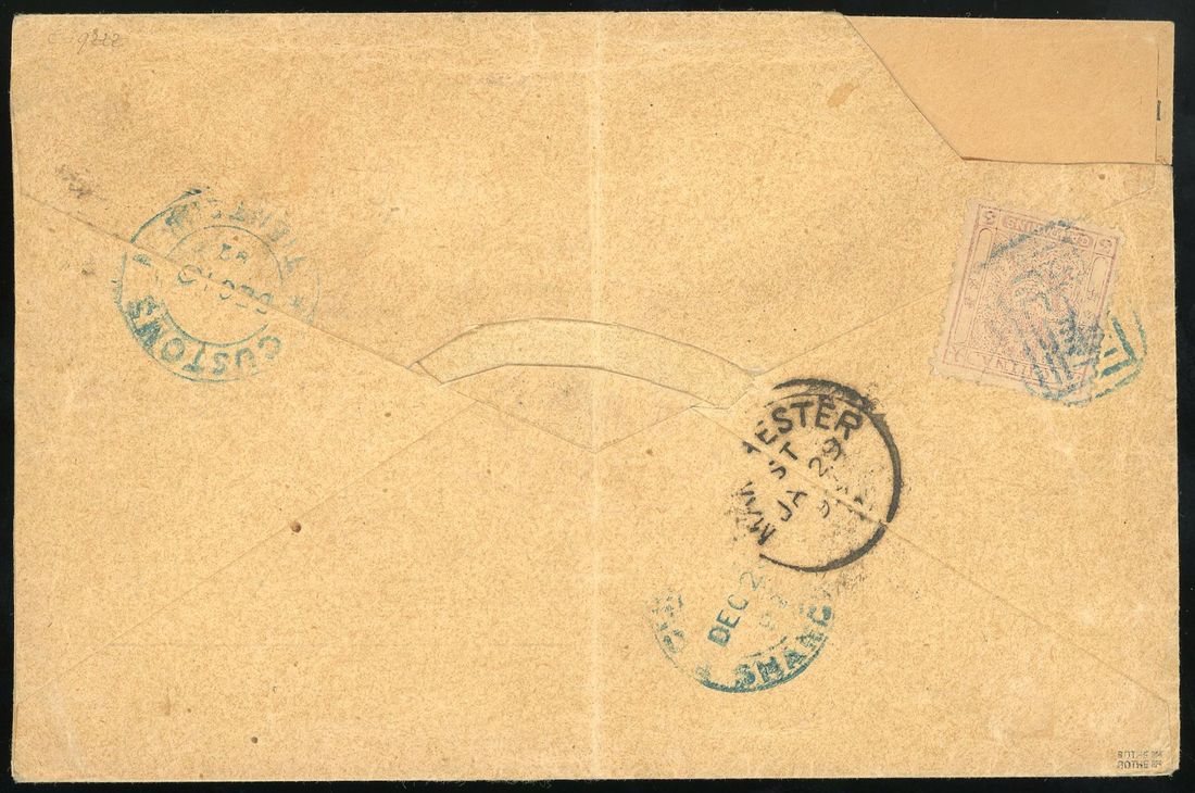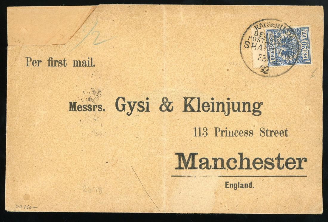 1892 (23 Feb.) Shanghai to England cover, bearing German 20 Pfening, tied by Deutscspost post Shanghai c.d.s., on the reverse with Tientsin customs c.d.s. (10.12.92), Shanghai Customs c.d.s. (20.12.1892), and transit Tientsin with small dragon 3 cds. tied by seal cansel, Manchester arrival c.d.s. (29.1.1893)