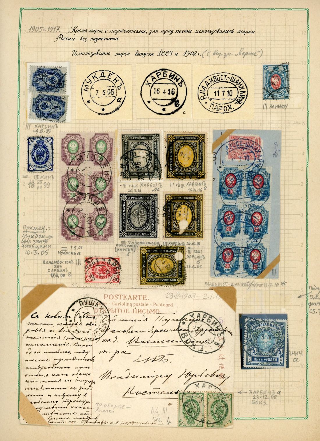 1899-1921 an unique Gold Medal collection form Vadim Ustinovsky, comprising 95 used stamps in singles, pairs, blocks plus one complete sheet with 6 labels and very scarce postal history pieces, cancellations including Harbin-Mukden, Vladivostok-Shanghai, steamship Harbin-Pristin, Kalgan border, Manchuria border and much more, also the very rare CER stations Kuanchendzy and Handackhetze markings, generally very fine.