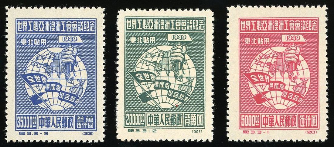 1949 (16 Nov.) World Federation of Trade Unions, Asiatic and Australiasian Congress, Peking. (C3NE), for use in the North-east. $5000 to $35000, set of three, unused, fine.