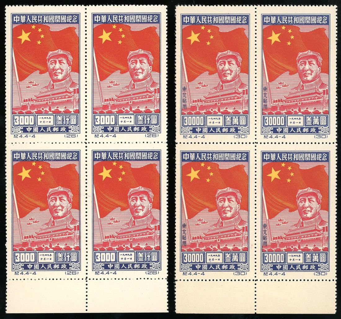 1950 (1 July) C4/ C4NE Inauguaration of Chinese People's Republic on 1st October 1949. Full set of block of four with lower margin. (2 sets)