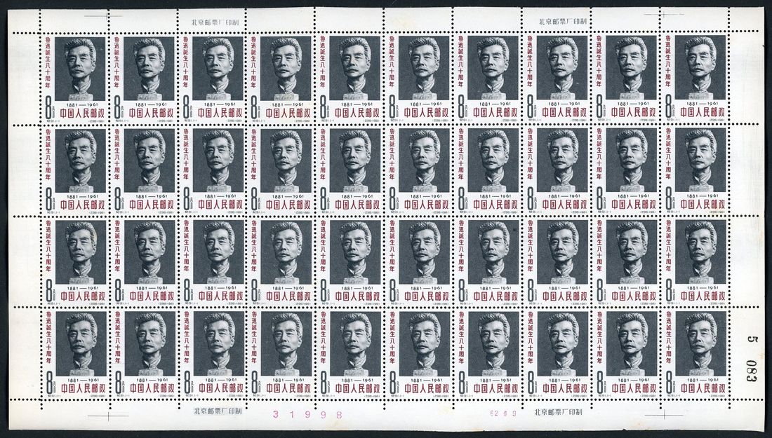 1962 (26 Feb.) C91 80th Birth Anniv. of Lu Hsun. 8f. set of one in full sheet of 40 (x18), unmounted mint, toning.