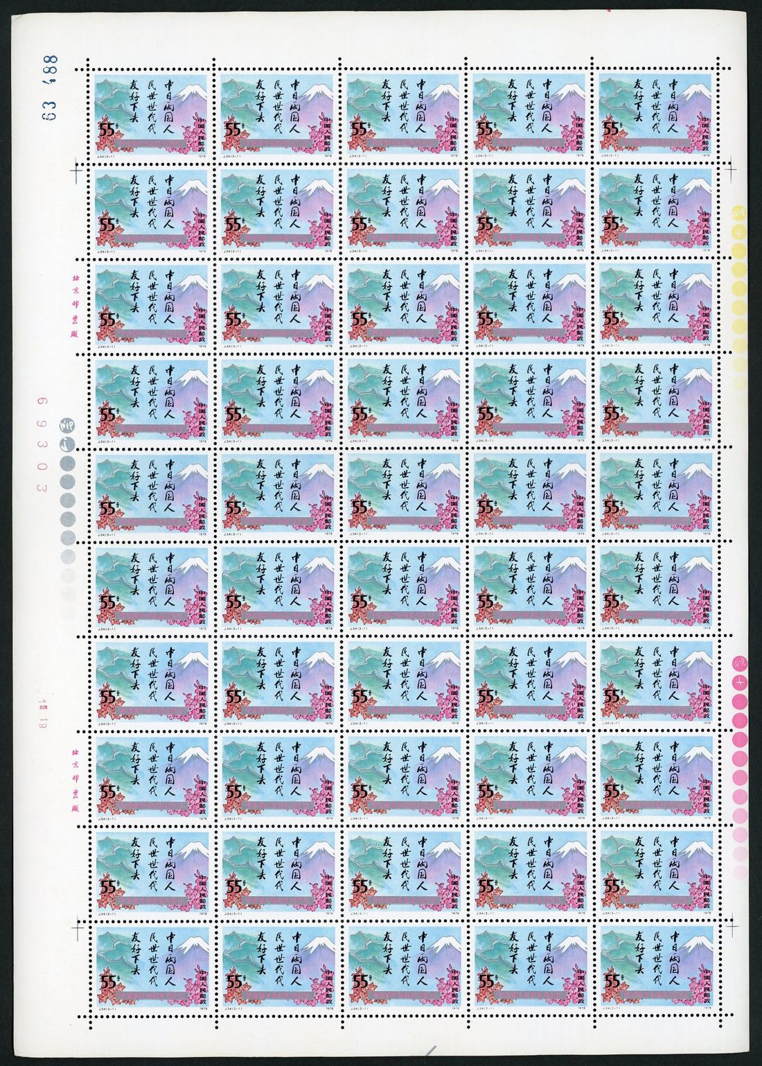 1978 (22 Oct.) J34 Signing of the Chinese-Japanese Peace Treaty. 8f. and 55f. set of two in full sheet of 50 (x 4), unmounted mint and toning.