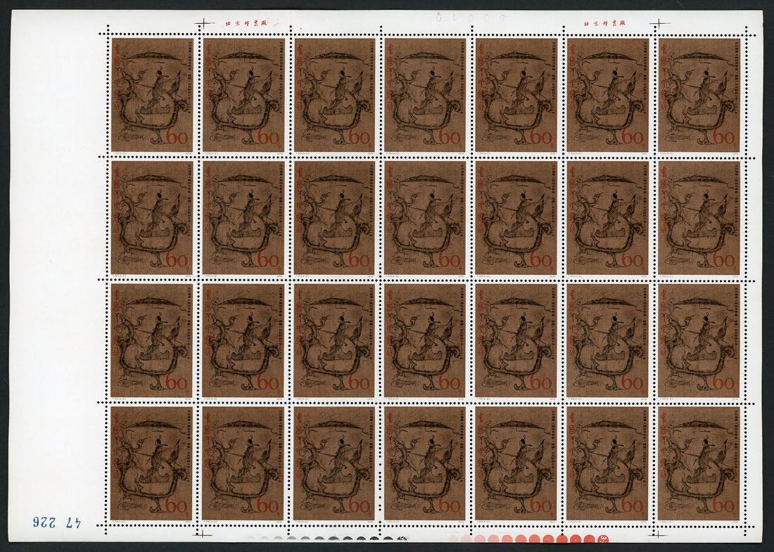 1979 (29 March) T33 Traditional Silk Paintings from an Ancient Tomb of the Warring States Period. 8f. and 60f. set of two in full sheet of 28 (x 4), one sheet with creases on left top corner. Unmounted mine, toning.