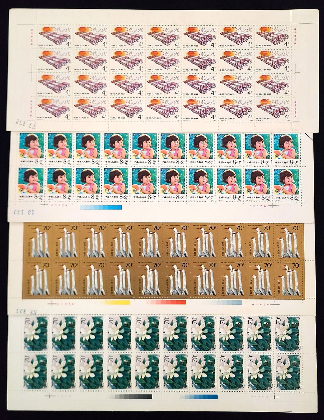 1984 (16 Feb.) T92 Children. 8f. set of two in full sheet of 50; 1986 (11 April) T110 Great White Crane. 8f. to 70f. set of three in full sheet of 50 (x2); 1986 (23 Sept.) T111 Mangolias 8f. to 70f. set of three in full sheet of 50. and 1989 (15 Nov.) T143 The Building up of National Defence. 4f. to 20f. set of four in full sheet of 28. All full sheets are unmounted mint and lightly toning.