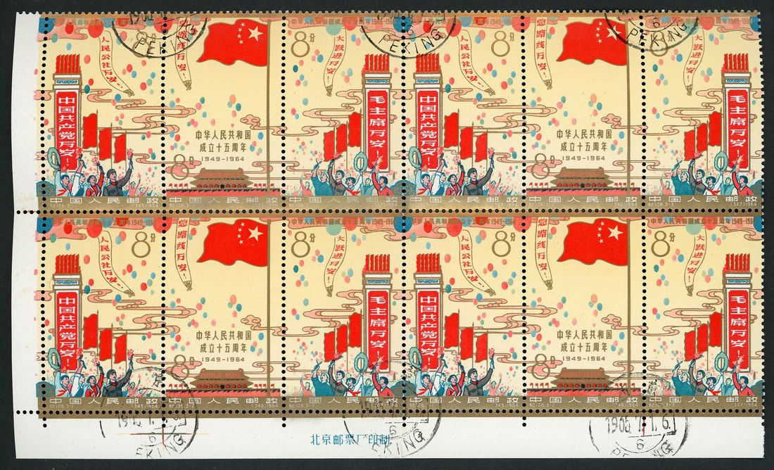 1964 15th Anniv. of People's Republic (C106), block of four with lower corner imprint margin; folded at center, used with cancelled to order c.d.s. S.G. 2213-2215