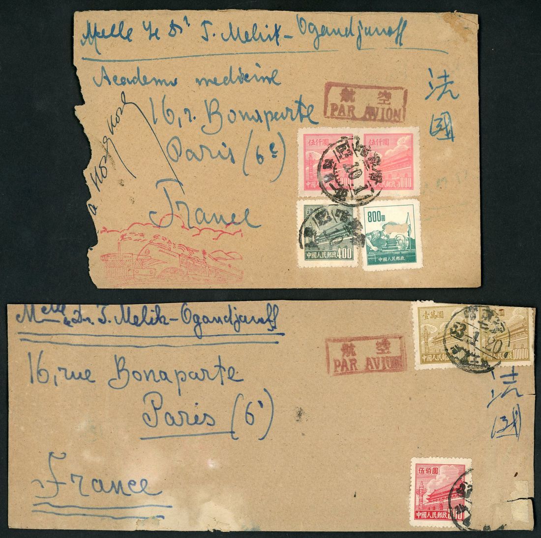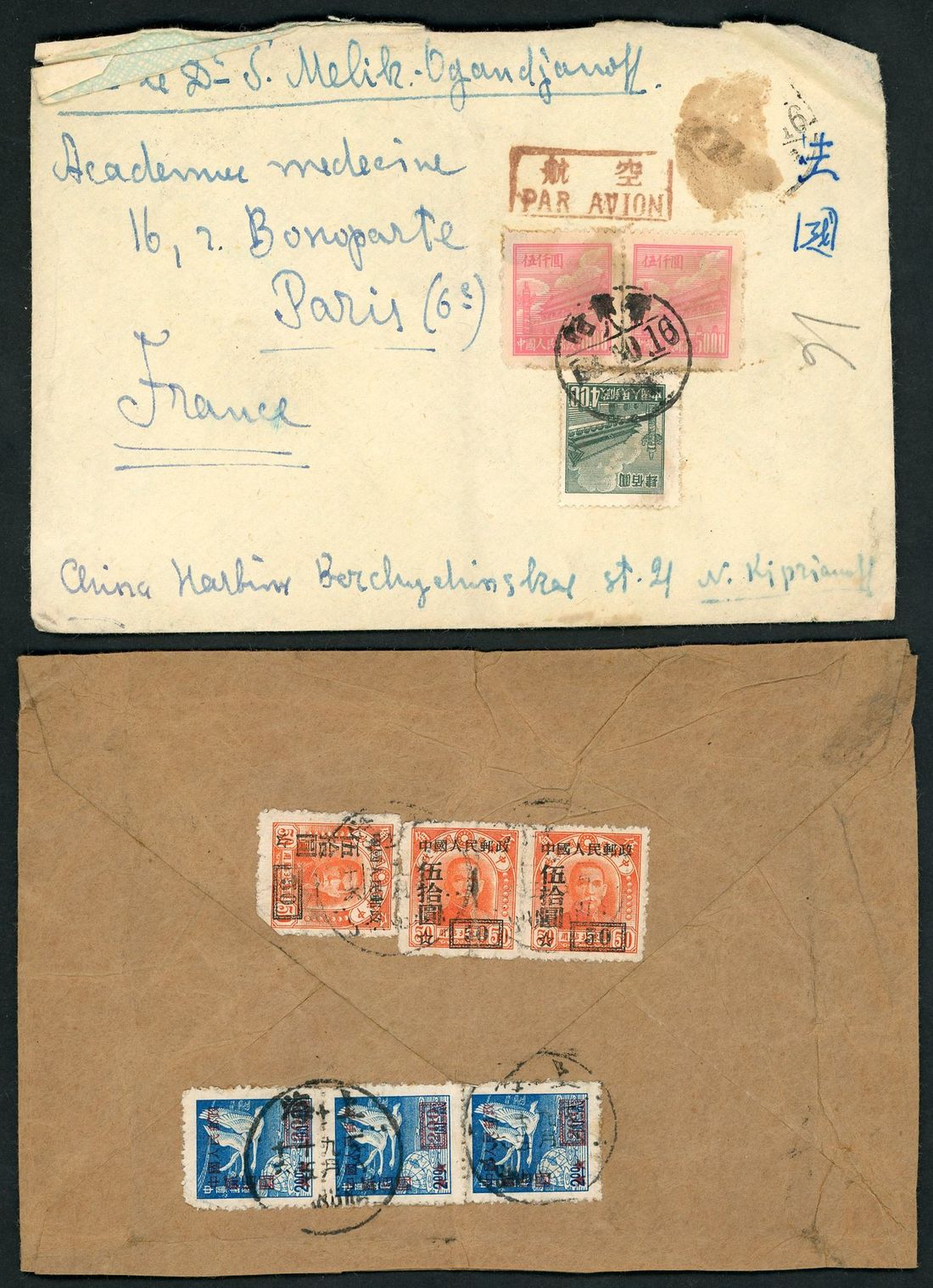 1950s a small lot of 8 covers; including 1953 (1 Oct.) Harbin via Canton (5.10) to France air cover, bearing R1 $5,000 (2), R4 $400 and R6 $800 tied by Harbin c.d.s.