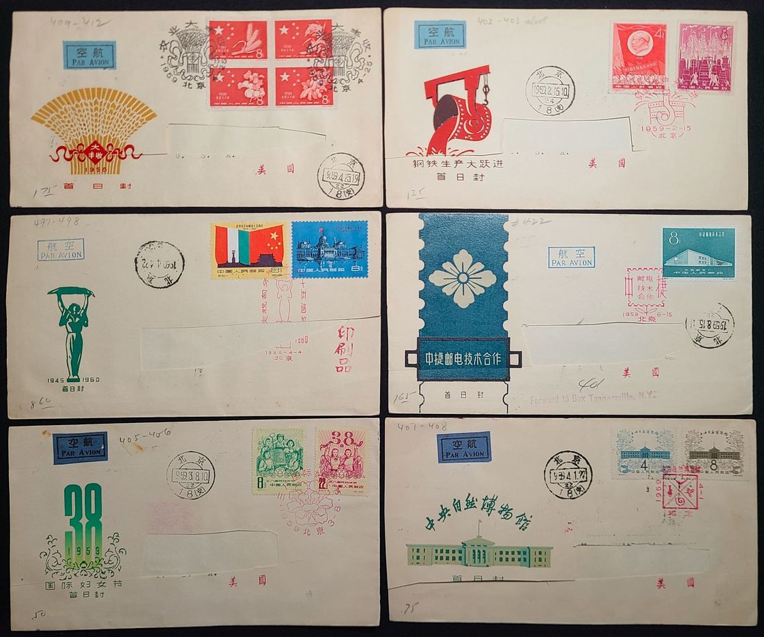 1959-1960 a group of 6 of "C" and "S" Issues F.D.C., Including S31, C58, C59, C60, C65, C78. All covers are sent out to U.S.A. by air, But all recipient addresses were cut off.