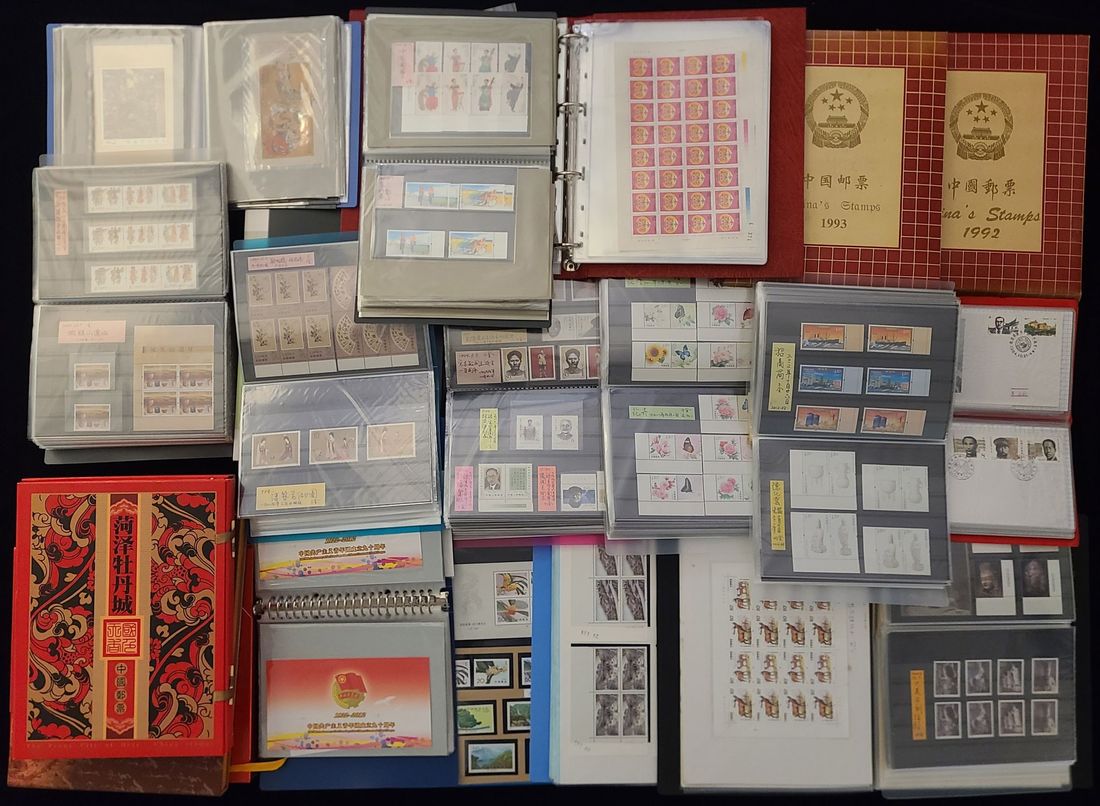 1990s -2000s issues in a box, most of them in block of four or six, f.d.c., miniature sheet, stamp booklet, 1992 and 1993 year book. High market value, please preview.