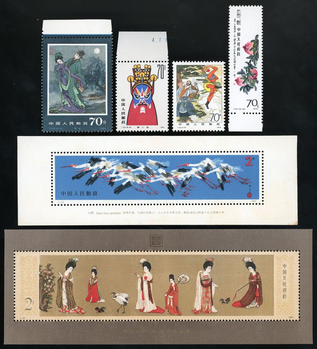 A lot of full set of "T" Issues, including: T43, T44, T45, T89 souvenir sheet, T99, T106 souvenir sheet, T110 souvenir sheet, T144 souvenir sheet, plus J45 souvenir sheet, and two set of R31. Unused