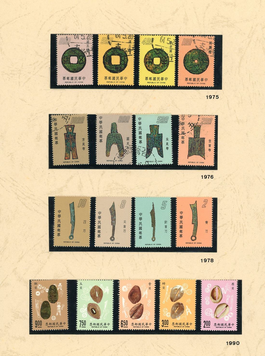 1975-1999 Taiwan atamps collection in album, including block of four and full sheet; Full set of "Ancient Coin Series" (usedand unused). set of 4 of 1997 Taiwan Dragons and Carp from wimdow Londsan Temple, etc.