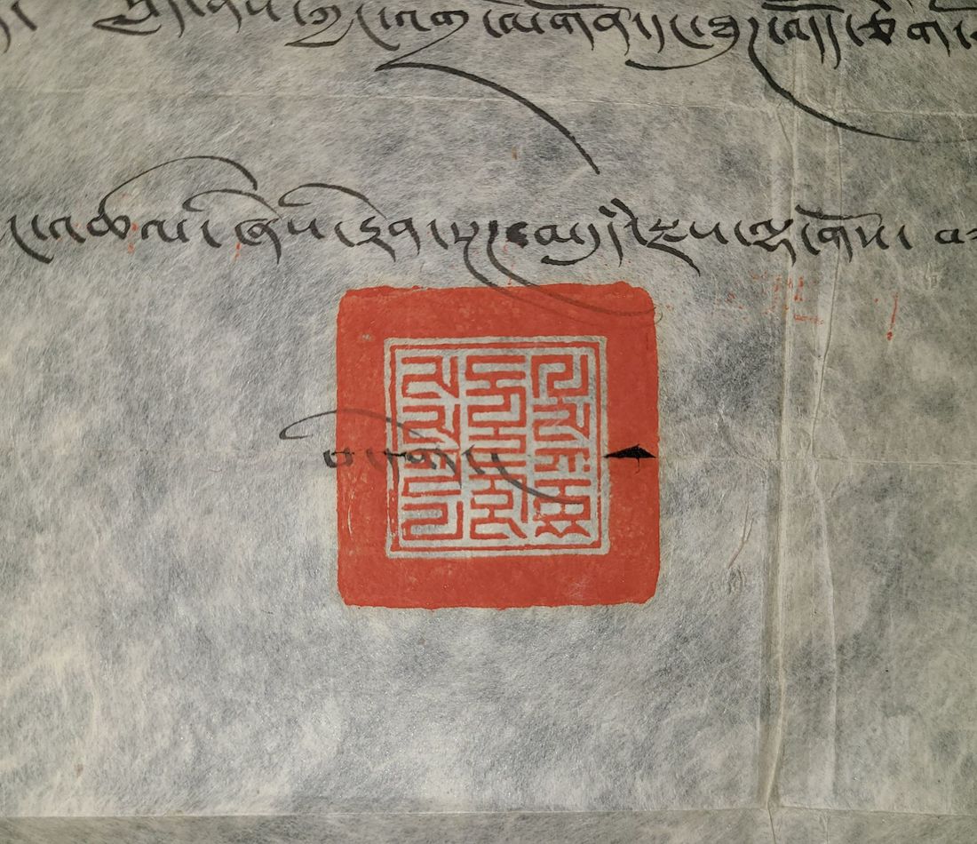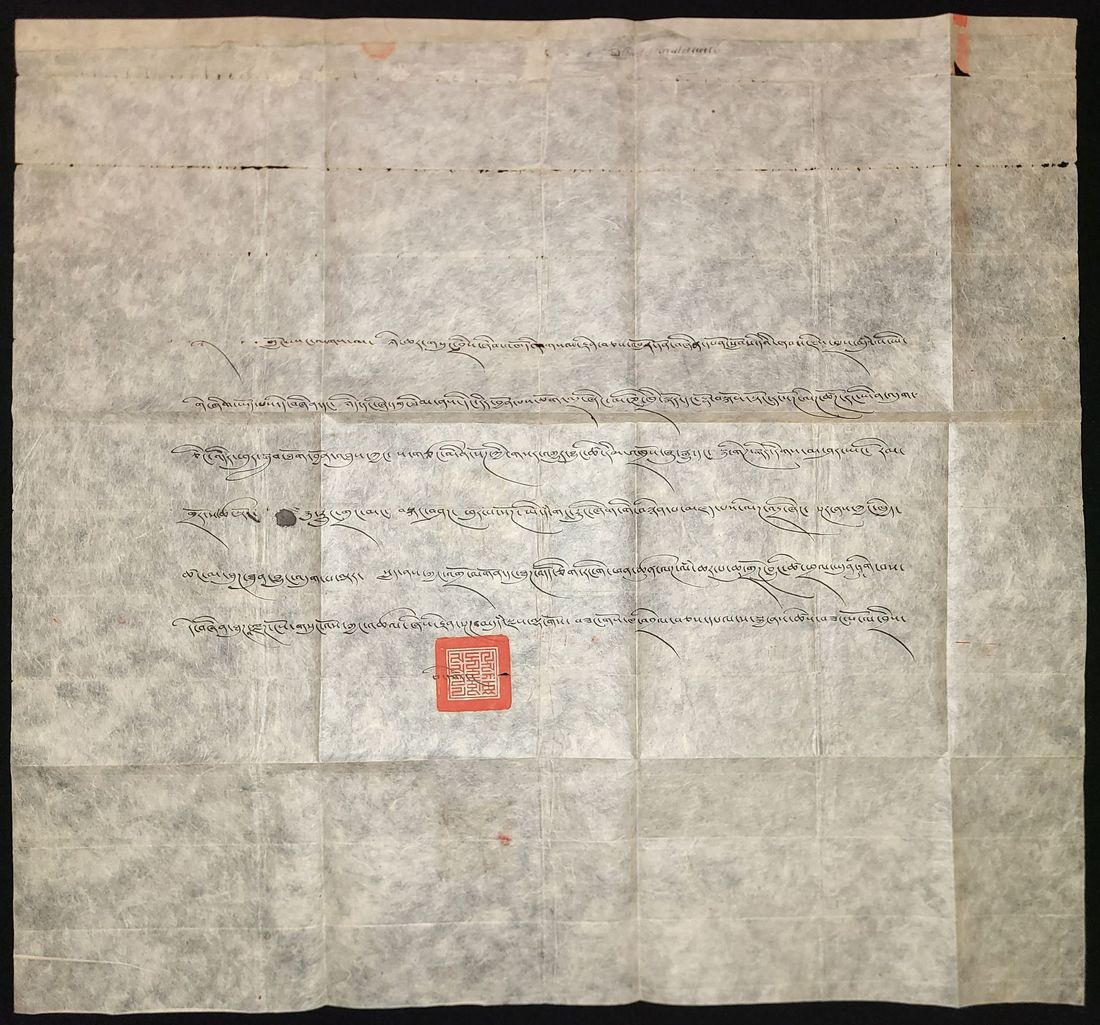 Pre-Stamp Covers, - 1910 scarf letter to the King of Nepal bearing a fine strike of the official small red ink seal of the Sakya Lama (42x42 mm) and showing the small private seal of the King of Nepal at foot (18mm) also in red. Fine and rare.