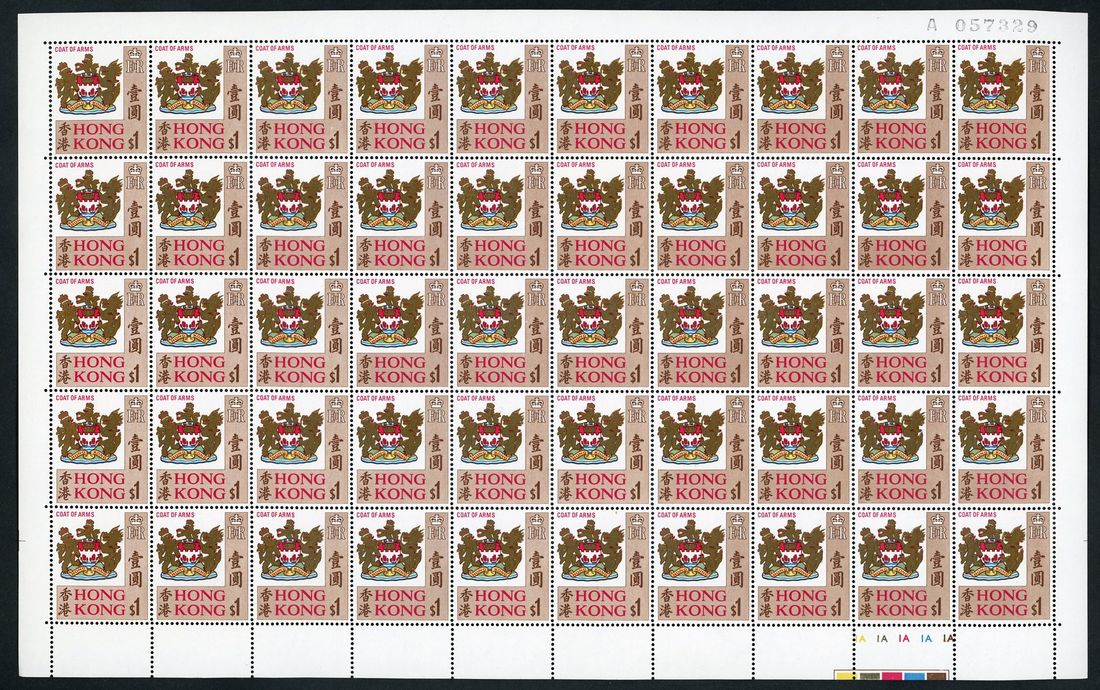 1968 (25 Sept.) HK Bauhinia Blakeana and Coast of Arms. Set of two. 65c.and $1. in full sheet. Unmounted mint.