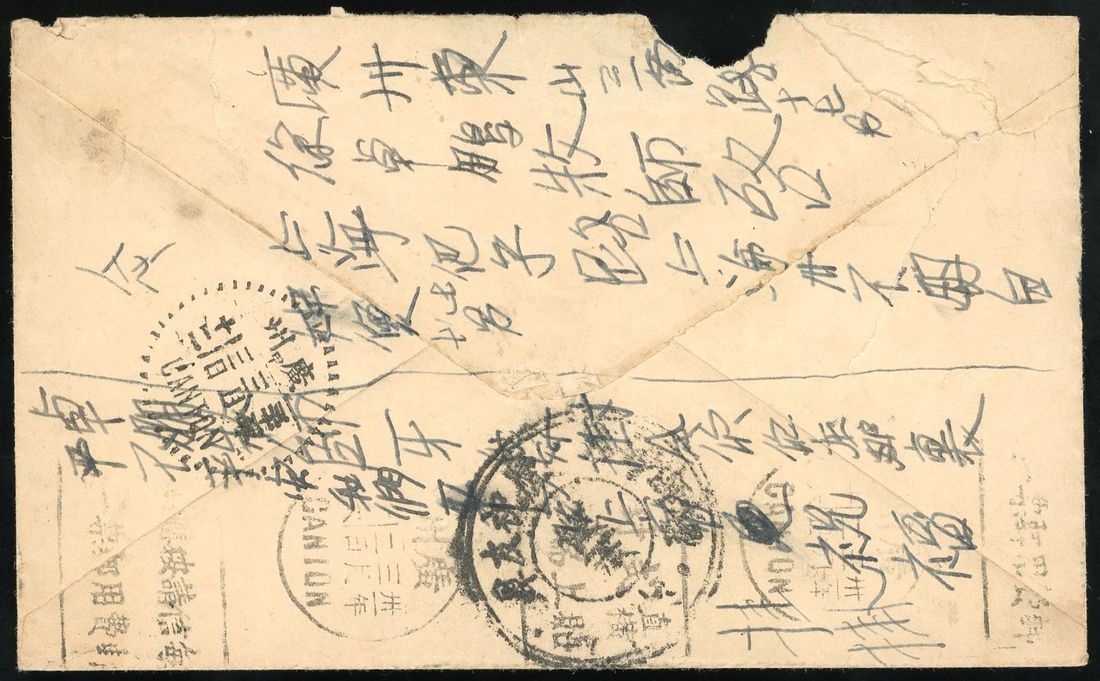 1942 (26 Feb.) Hong Kong to Canton cover, bearing Japan 4s. tied by Hong Kong c.d.s., Canton arrival c.d.s. (3.3) alongside. On the reverse with an other arrival c.d.s. and a commemorative stamp from Canton to celebrating the Victory of Allied Forces (Japanese Army).