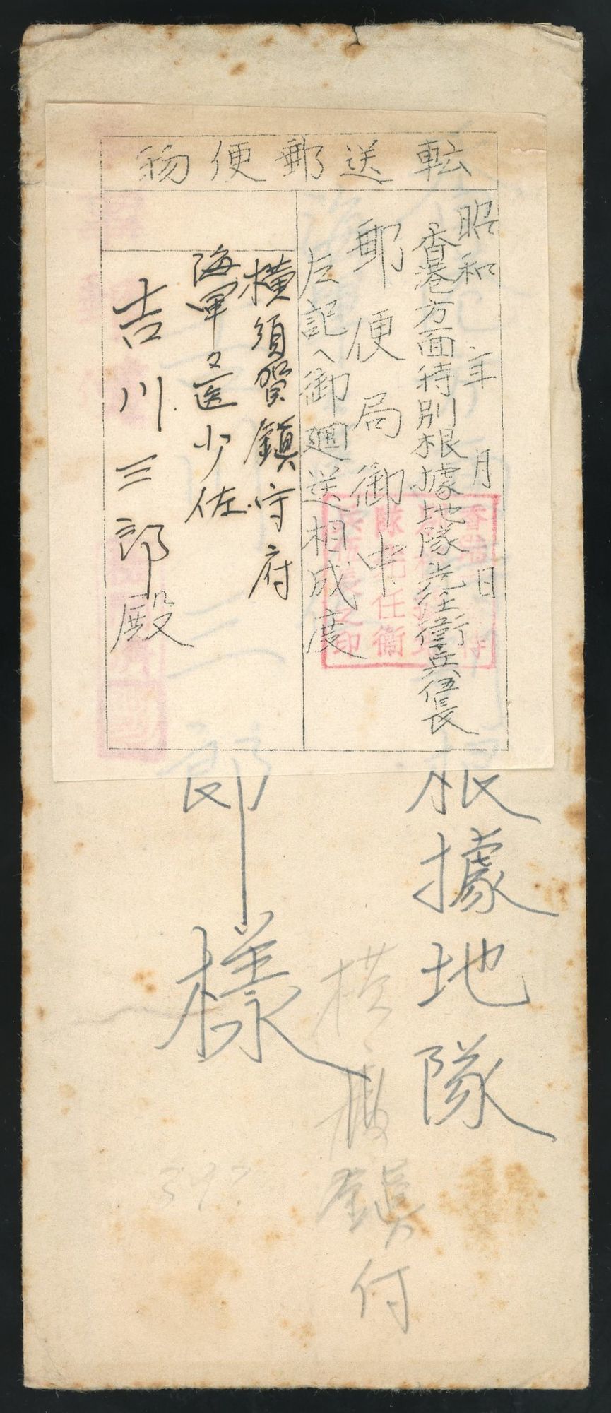 1942-1945 Military cover sent from Japan to the Hong Kong Special Base Area bears an inspection stamp. Since the recipient had been transferred back to Yokosuka, Japan, the Hong Kong Special Base Area affixed a return slip to the letter and sent it back to Japan. The slip is stamped with "Seal of the Former Corporal of the Hong Kong Special Base Area." This is a rare example of a military return back envelope from the Japanese occupation of Hong Kong. With the original letter.