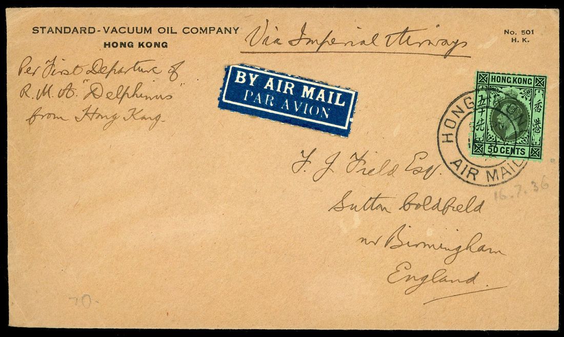 1936 (16 July) Hong Kong to England First R.M.A. Delphins cover, bearing 50c. tied by Hong Kong Air Mail c.d.s., on the reverse with halfpenny stamp in England, tied by birmingham c.d.s. (29.7)