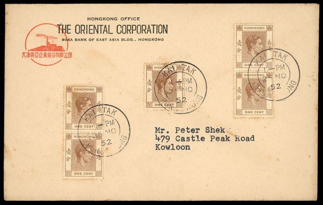 1952 (25 Nov.) Hong Kong to Local cover, bearing KGVI 1c. x 5, tied by Kai Tak c.d.s.