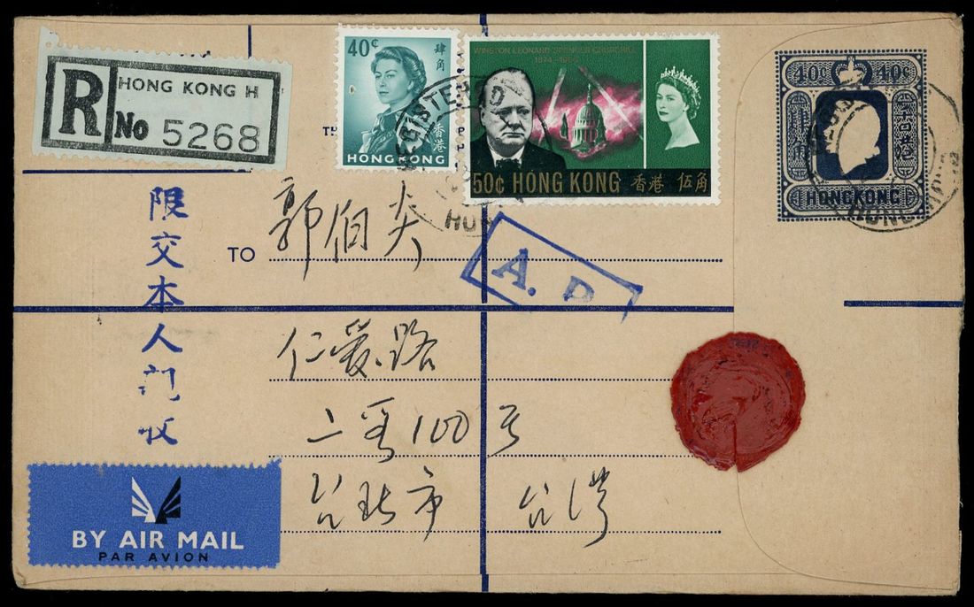 1966 (April) Hong Kong to Taiwan registered air insurance 40c. postage cover, uprated 90c., with "Delivery must be made in person" blue seal. on the other side with Taiwan arrival c.d.s. (29.4)
