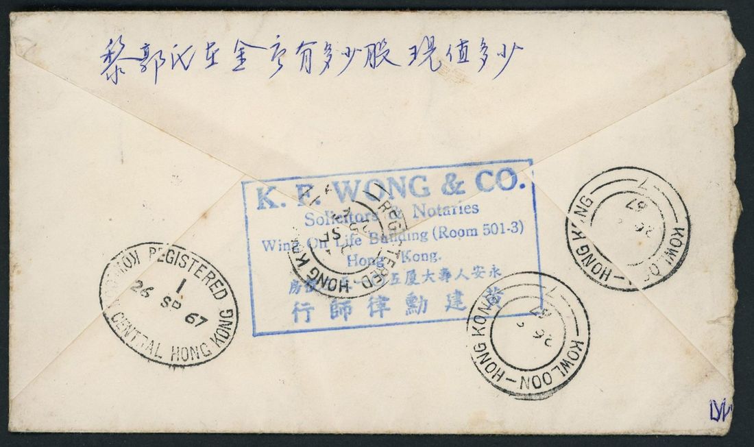 1967 (26 Sept.) Hong Kong registered cover to local, bearing 50c. tied bu Registered /Hong Kong c.d.s., on the reverse side with oval Kowloon Registered c.d.s.