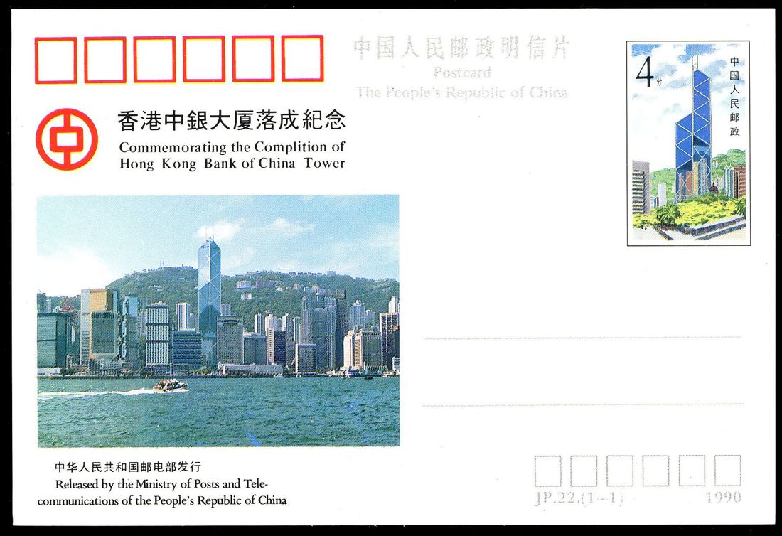 1990 Error 4-cent postage postcard of Commemorative for the completion of the new Bank of China Tower in Hong Kong. Fine,