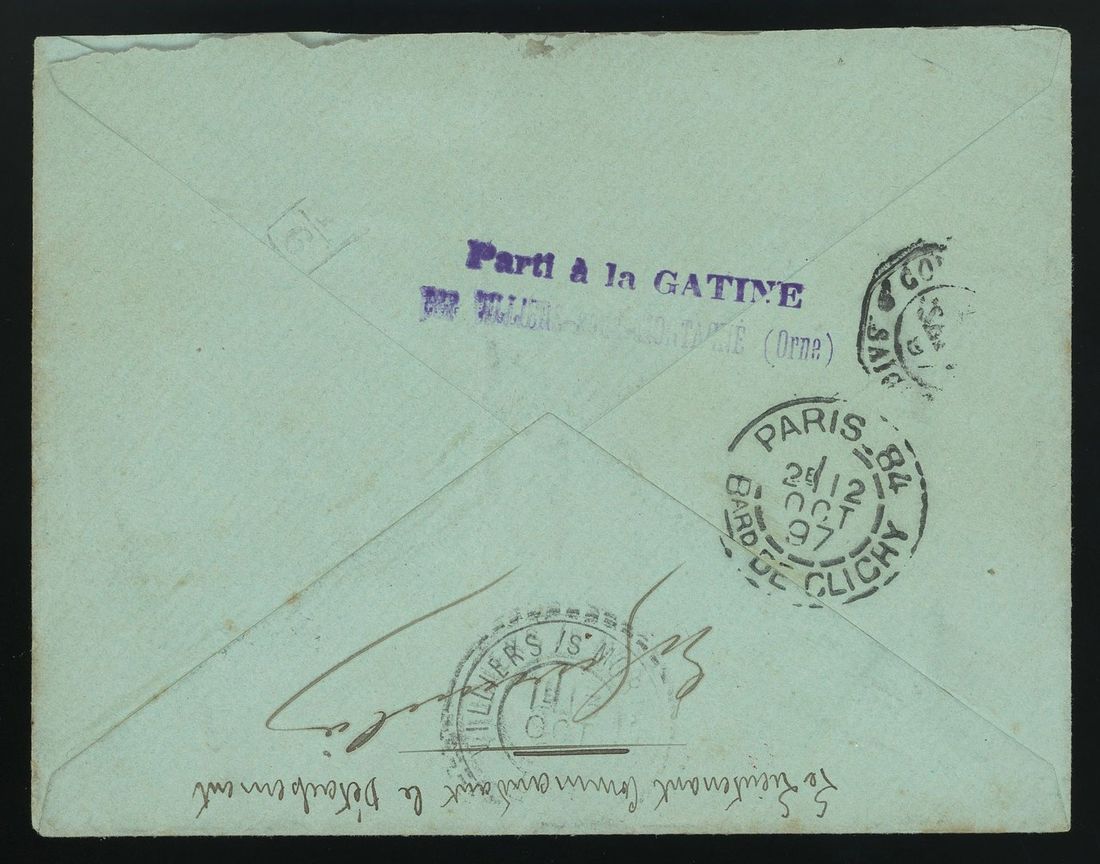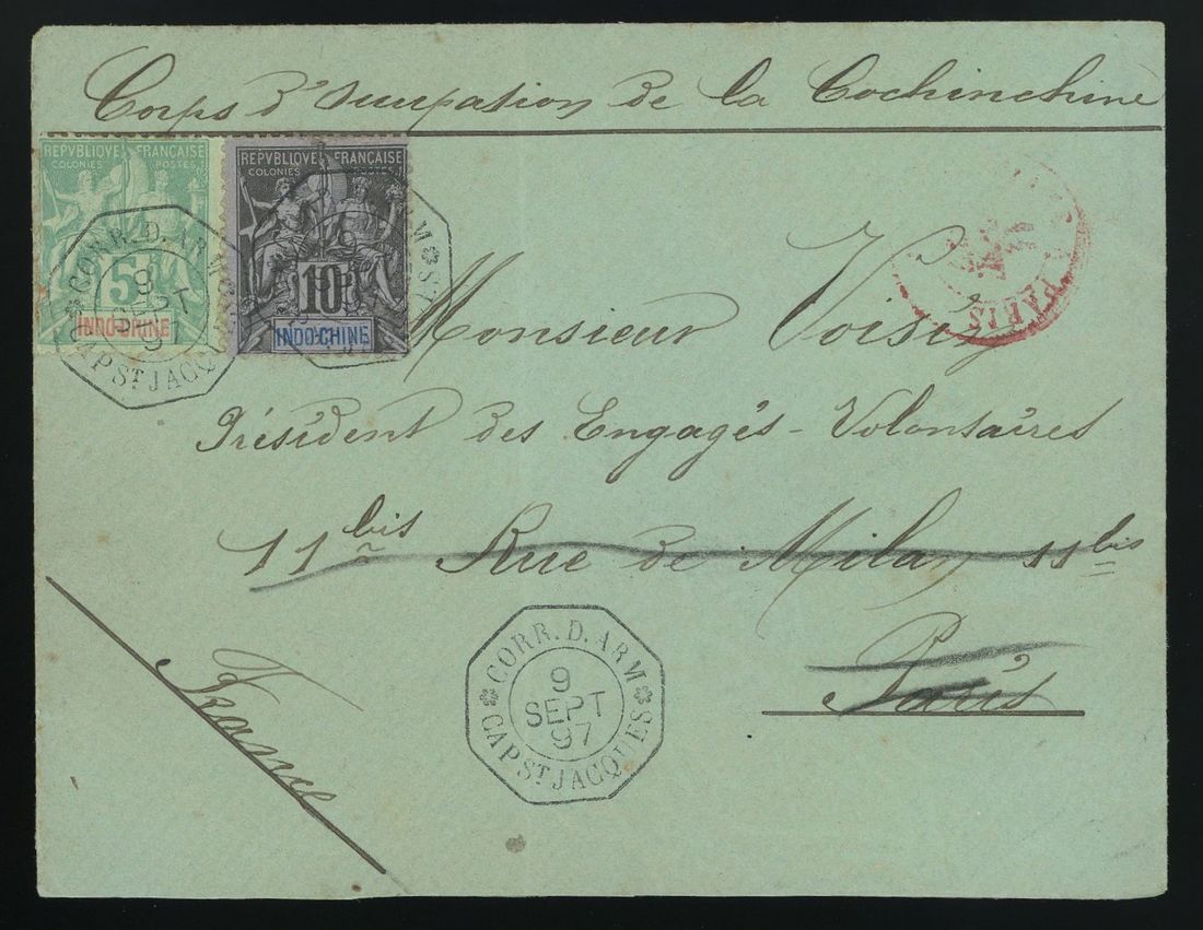 1897 (9 September) cover endorsed 'Troupes de la Cochine' addressed to Paris bearing 5c & 10c tied by octagonal 'Corr. D. Arm/Cap St Jacques' cds and signed by the commander on reverse, Saigon transit and Paris arrival (12 October) and forwarded with instructional 'Partia la Gatine/Par Mortagne' with Orne arrival (13 October).