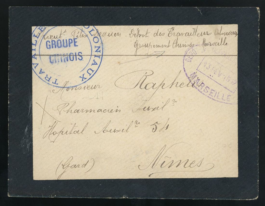 1917 stampless mourning cover endorsed 'Lieutenant Felix Deguen, Depot des Travailleurs Coloniaux/ Groupement Chinois, Marseilles' addressed to Nimes cancelled by double circular 'Travailleurs Coloniaux/ Groupe Chinois' in blue and oval 'Depot de Travailleurs Chinois/ Marseille/ 13 Fev 1917'.