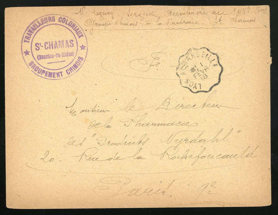 1918 cover addressed to Paris cancelled by Lyon a Marseilles ambulant cds with circular 'Travailleurs Coloniaux/ St. Chamas/ Groupement Chinois'.