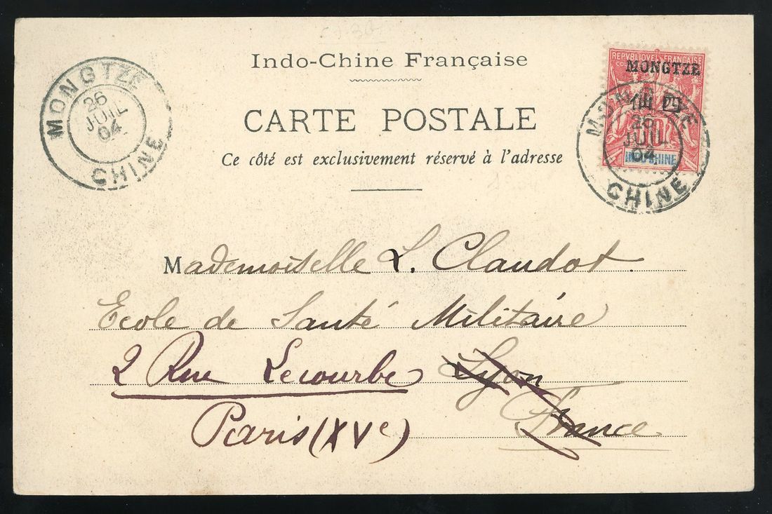 1904 (26 July) Picture postcard of 'Annamite using blowpipe' addressed to Paris bearing Mengtsz 4c. on 10c tied by Mongtsz-Chine cds. Scarce early first type postmark.