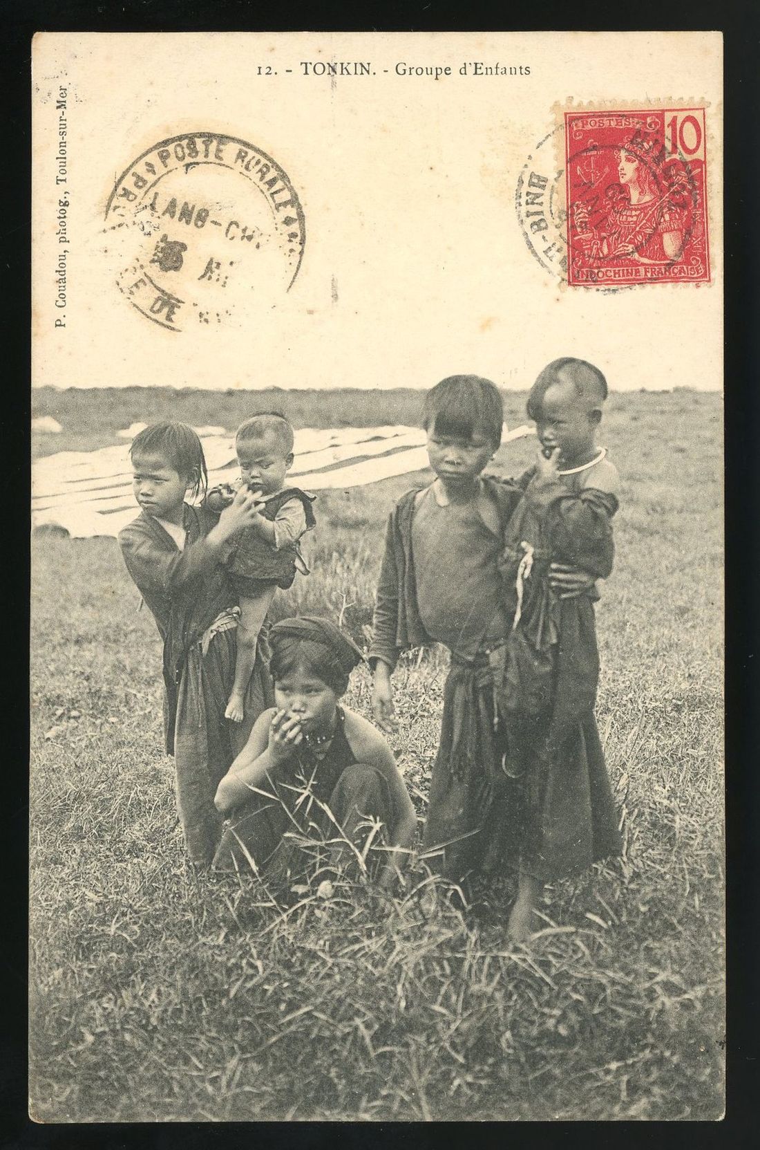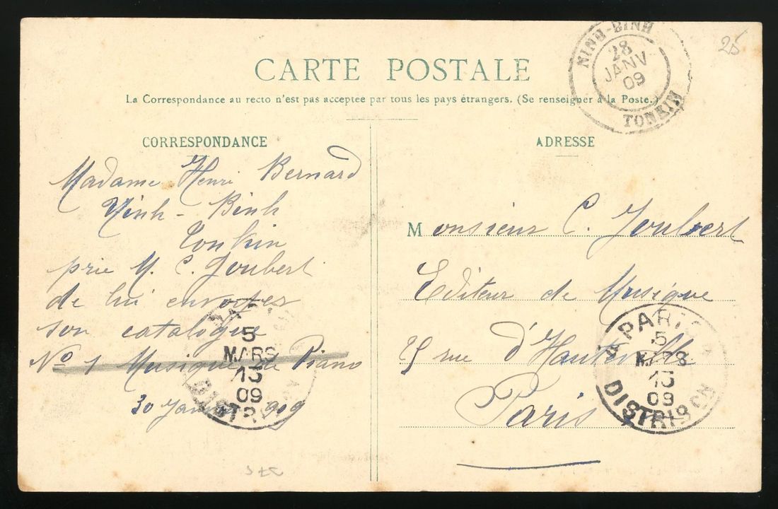 1909 picture postcard addressed to Paris bearing 10c tied by 'Ninh-Binh/Tonkin' cds with adjacent 'Poste Rurale/Lang-Chu/Province de Ninh-Binh' cds with Paris arrival cds. Ex Desrousseaux.