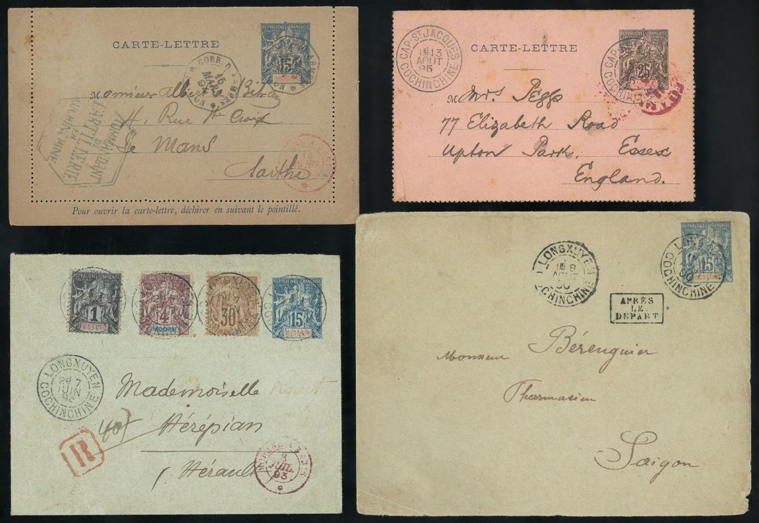 Indo-Chine : 1894-1902 small range of used stationary (14) including Military mail (2), small villages used with Bake, Bencat, Cap St. Jacques (4), Longxuyen (3), Rachgia (2), Tieucan, fine.