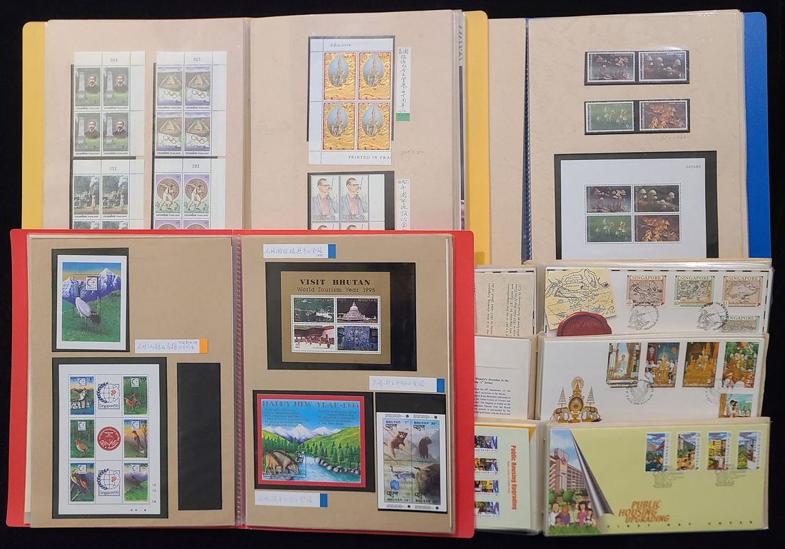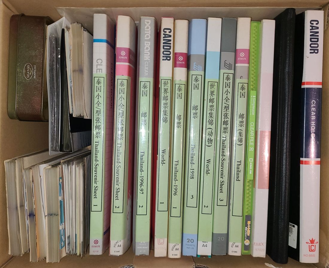 Thirteen collection albums and ten small albums of Thai, Singapore and other countries stamp collection. Including various commemorative stamps, souvenir sheets, block of four and F.D.C; Thai King Gold-plated Stamps block of four, etc., there are many varieties, too numerous to list, please preview.