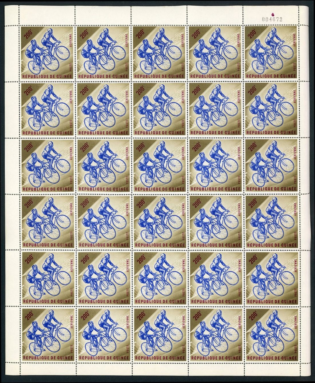 New Guinea 1972 Cycling 200fr. 84 sheets of 25 (2100 stamps), a few sheets with damaged perforations, catalogie value over USD8000. Scott C125. Photo