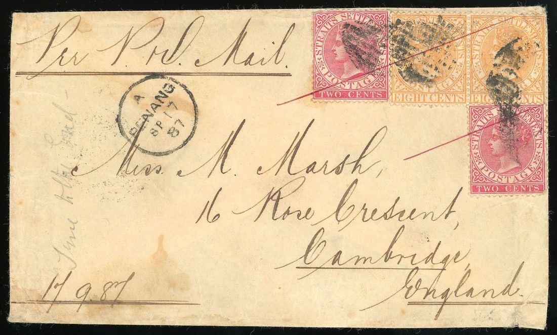Malaysia : 1887 (17 Sep.) envelope to Cambridge, England bearing Q.V. 2c. pale rose (2) and 8c. orange pair tied by rhomboid of dots obliterator, with good strike of Penang (17.9) straight line c.d.s., on the reverse showing Cambridge (17.10) arrived c.d.s., fine.