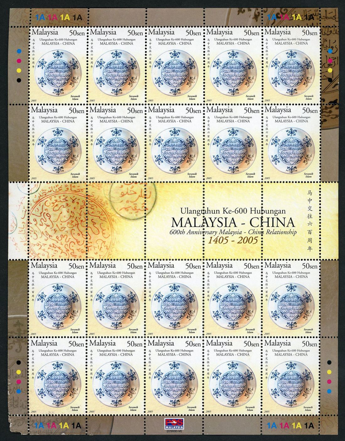 Malaysia : 2005 600th Anniversary Malaysia - China Relationship 50sen, sheet of twenty, unmounted mint, toning, unissued, very scarce, fine.