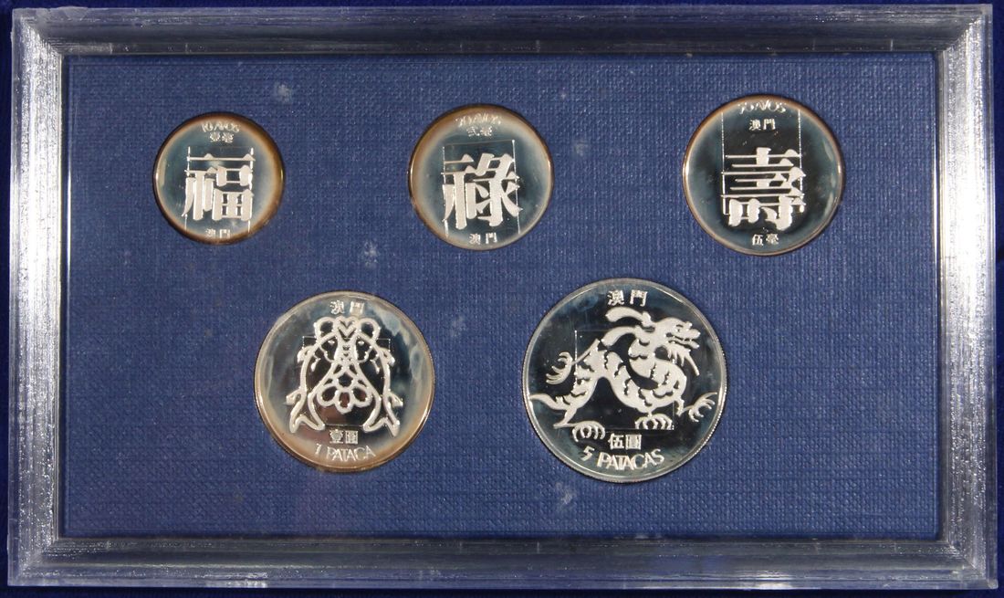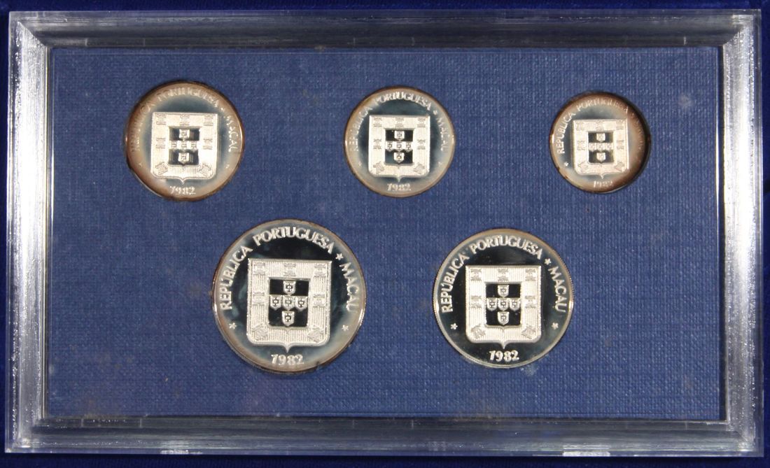 Macau, silver proof set of 10, 20 50 avos and 1, 5 patacas, special issue for the 1982 new coinage, 92.5% silver, weigh 3.2g, 4.6g, 5.7g, 9.0g and 10.7g respectively, mintage 2000, with original certificate no. 1464 and box, rim toning, uncirculated.(5 coins)