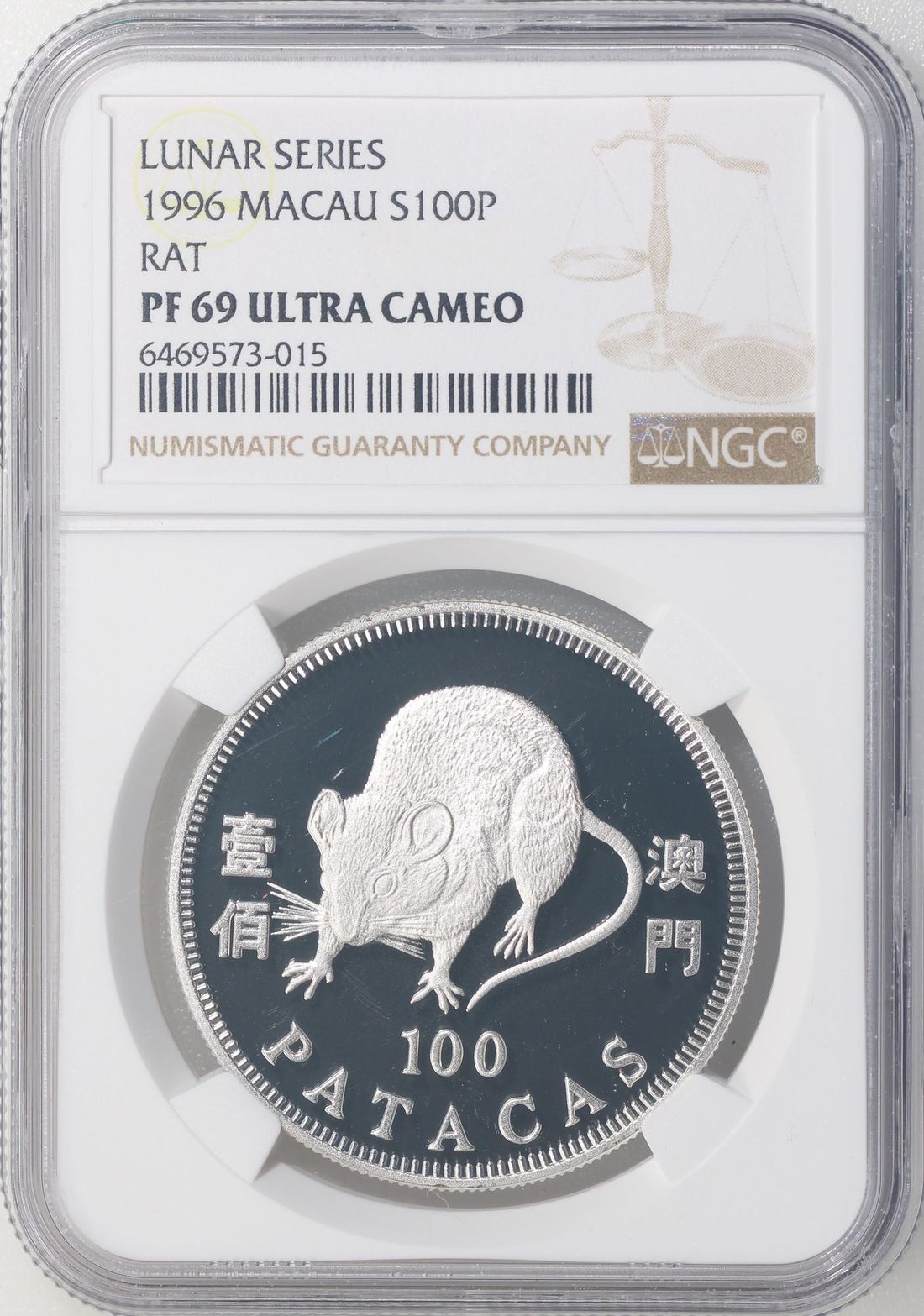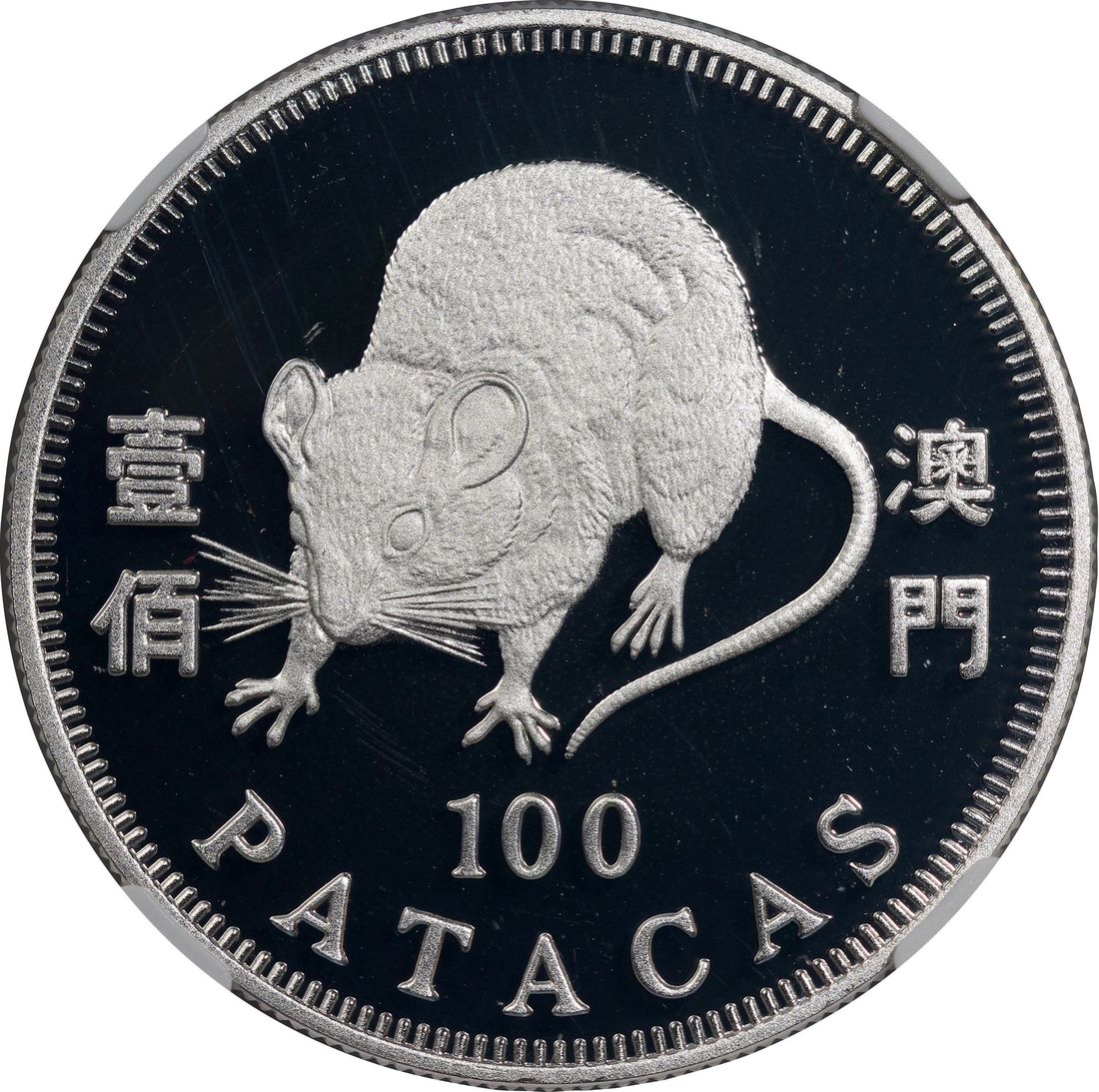 Macau, [NGC PF69UC] silver proof 100 patacas, 1996, Year of the Rat, ASW 0.84oz, with original certification and packaging, Cert. #6469573-015