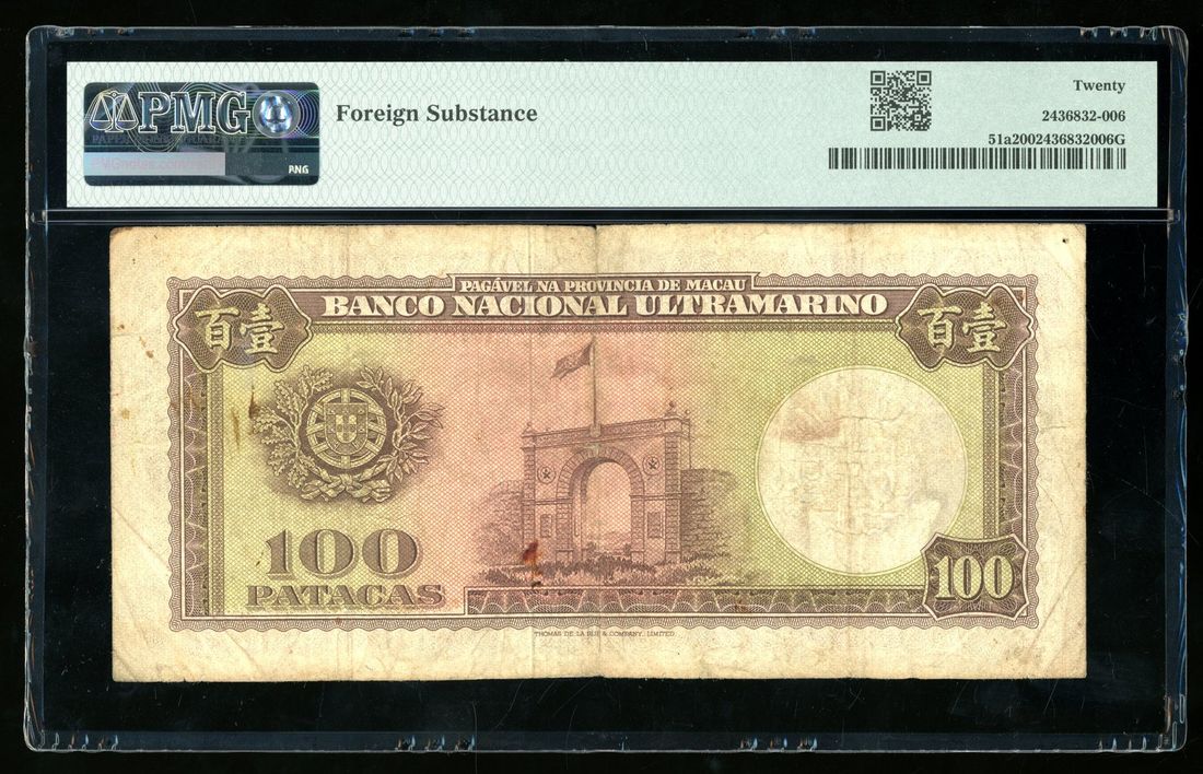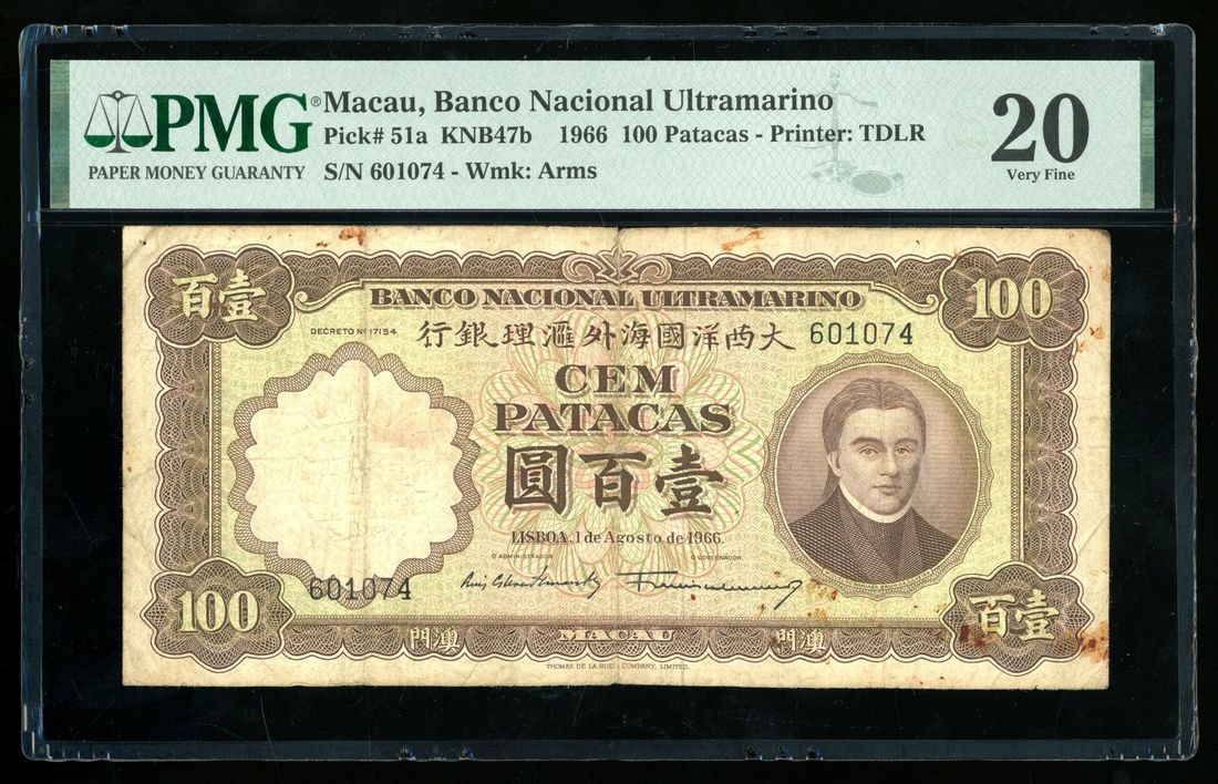 Banco Nacional Ultramarino, Macau, 100 patacas, 1966, serial number 601074, (Pick 51a), PMG 20, foreign substance. Though the later type but still not commonly seen without hole punched