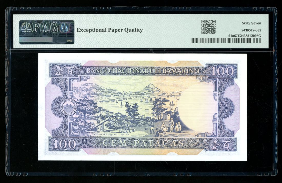 Banco Nacional Ultramarino, Macau, 100 patacas, 12.5.1984, radar serial number PX00200, (Pick 61a), PMG 67EPQ. Fancy serial note as well as being a high grade example with only 4 better on PMG census