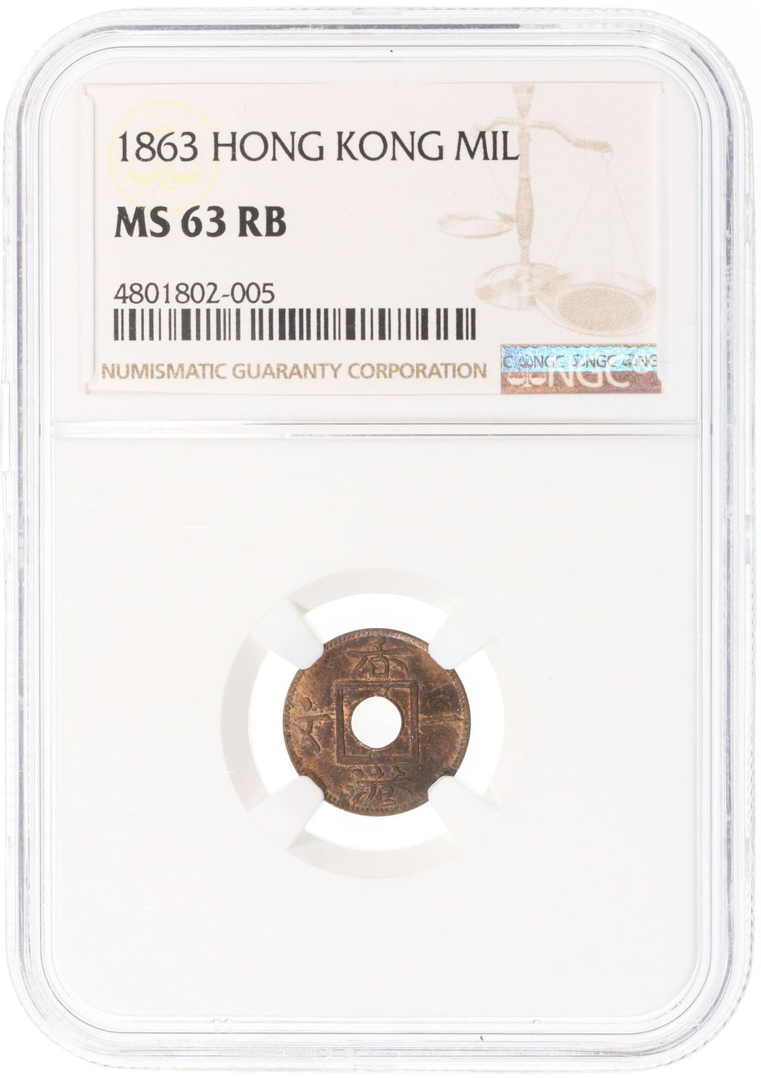 Hong Kong, Victoria, [NGC MS63RB] bronze 1 mil, 1863, Cert. 4801802-005