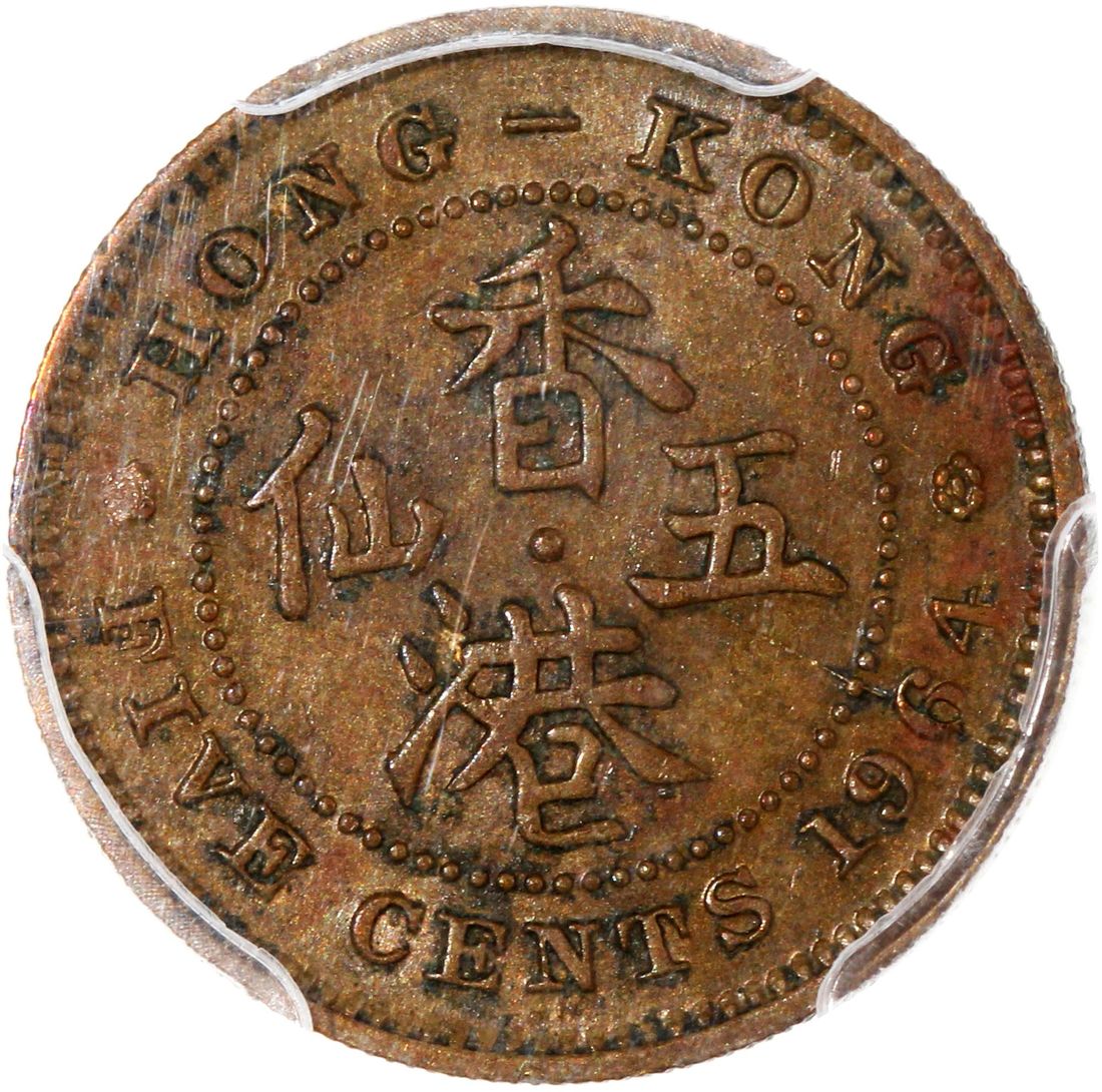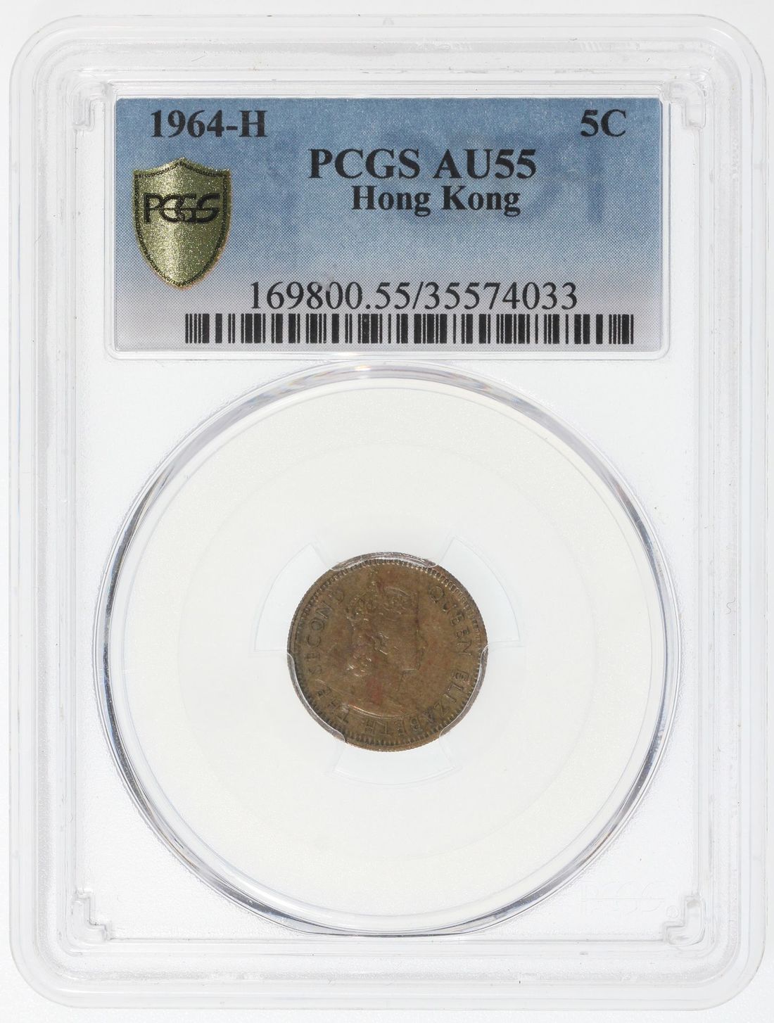 Hong Kong, Elizabeth II, [PCGS AU55] nickel brass 5 cents, 1964-H, Cert.# 35574033. Key date