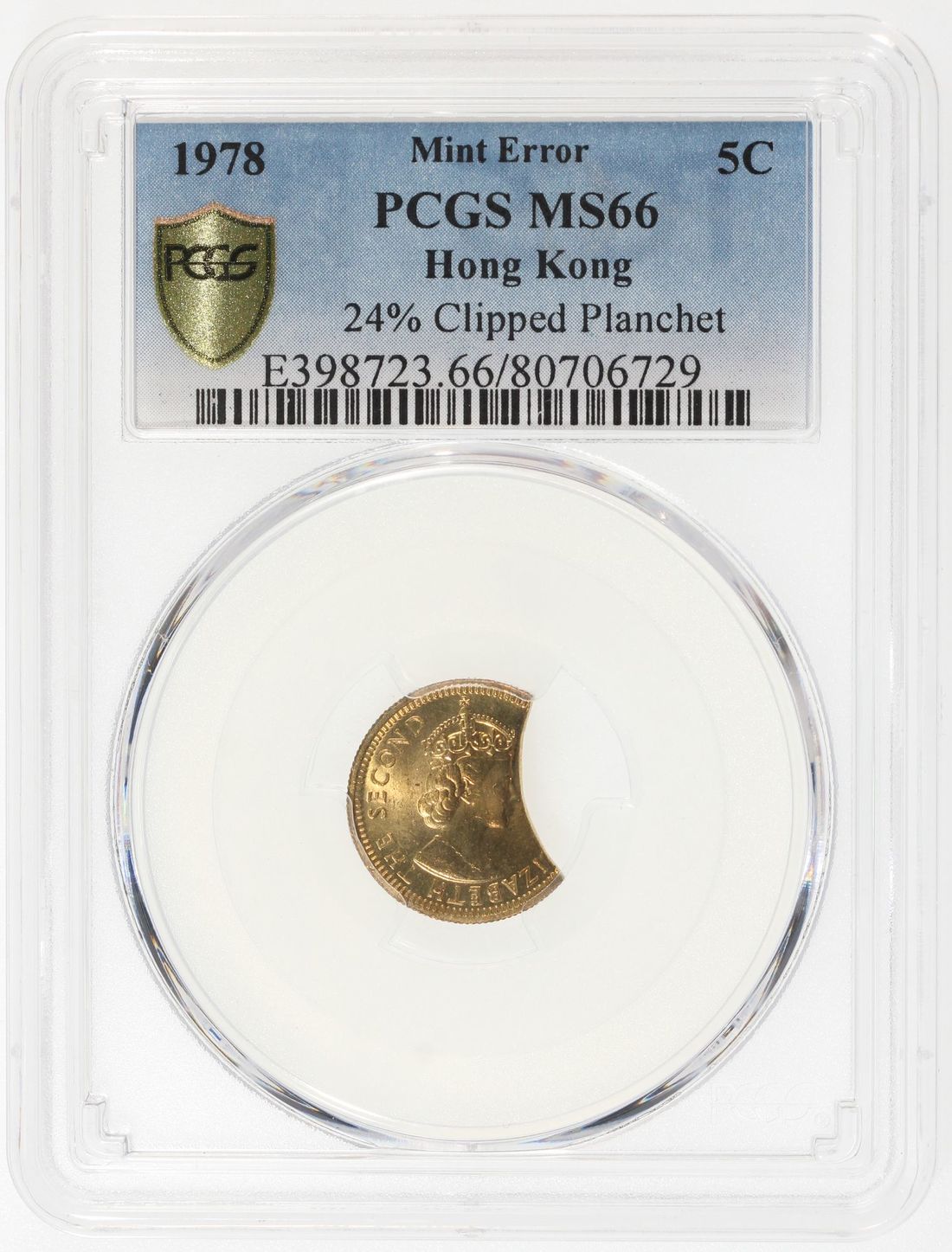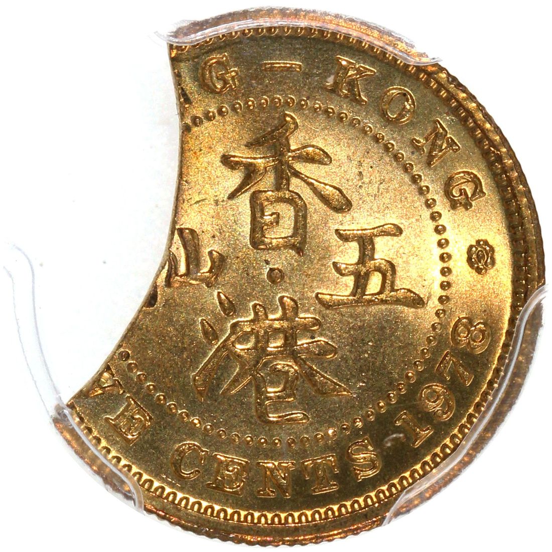 Hong Kong, [PCGS MS66] MINT ERROR 5 cents, 1978, "24% clipped planchet", #80706729. A fairly dramatic error