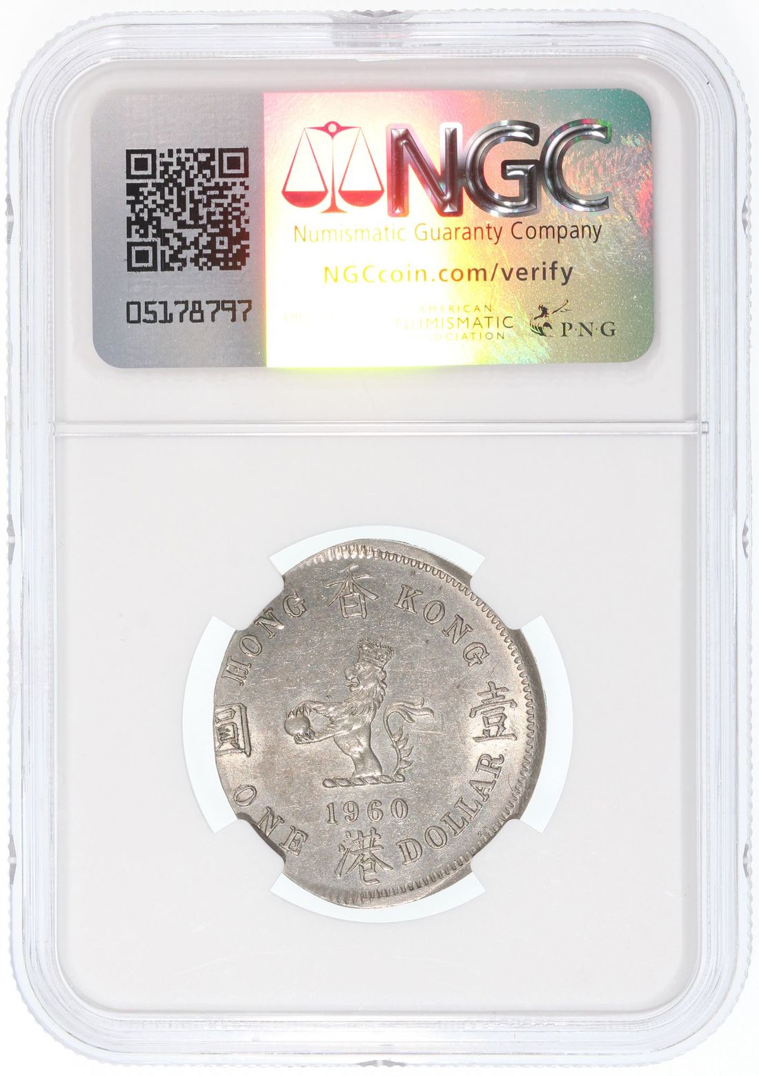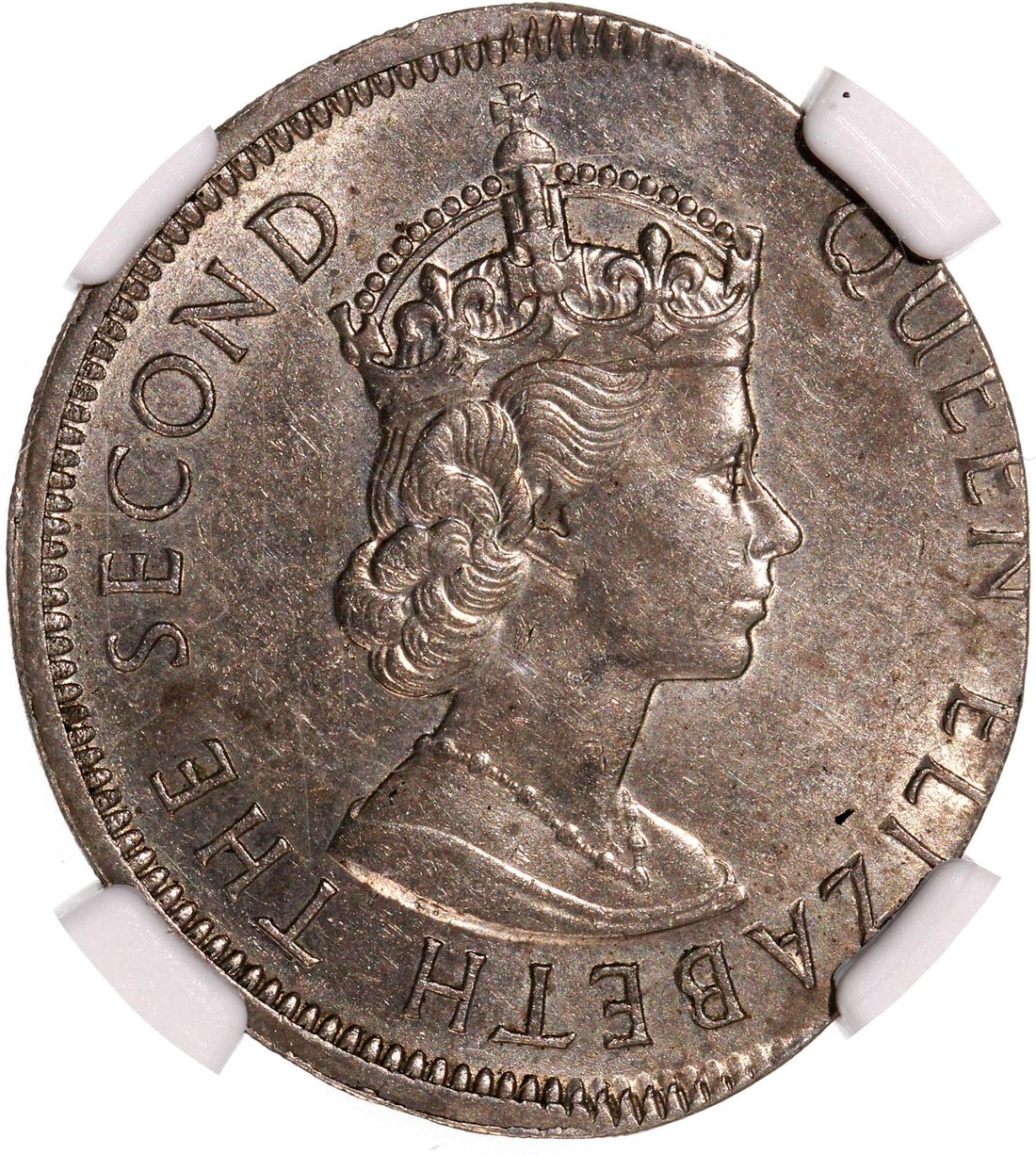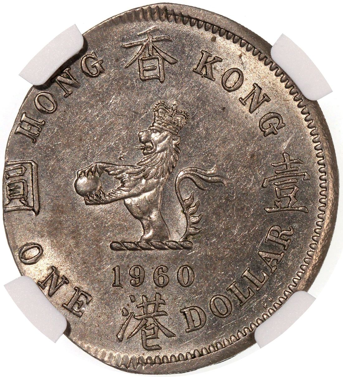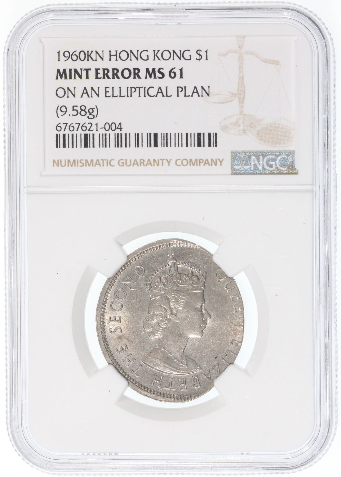 Hong Kong, [NGC MS61] MINT ERROR $1, 1960KN, 'On An Elliptical Plan', 9.58g, Cert.# 6767621-004, a lovely olive shape error coin, interesting piece