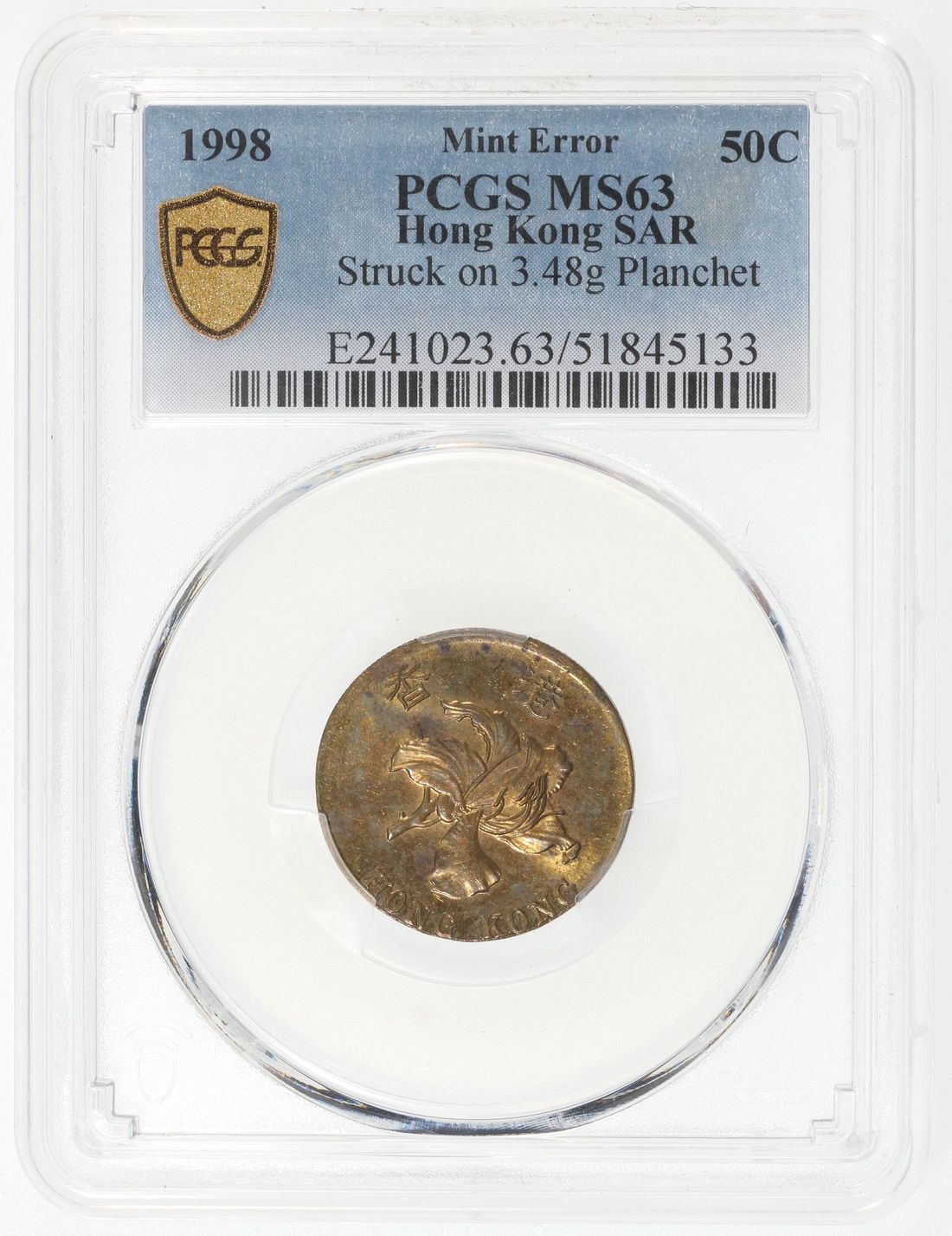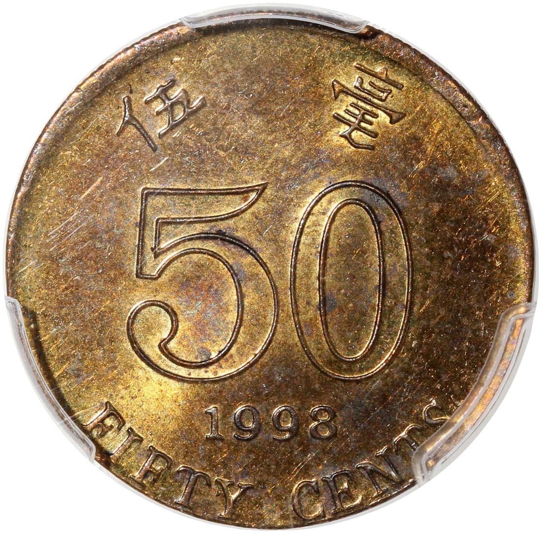Hong Kong, [PCGS MS63] MINT ERROR 50 cents, 1998, "struck on 3.48g planchet", correct planchet weigh 4.92g,