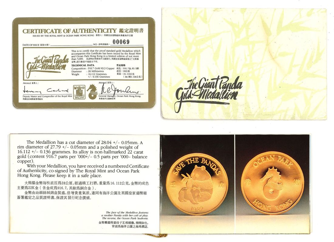Hong Kong, proof gold medal, 1982, "Save the Panda - Ocean Park", 16.112g, .9167 fineness, struck by Royal Mint, mintage 5,000,