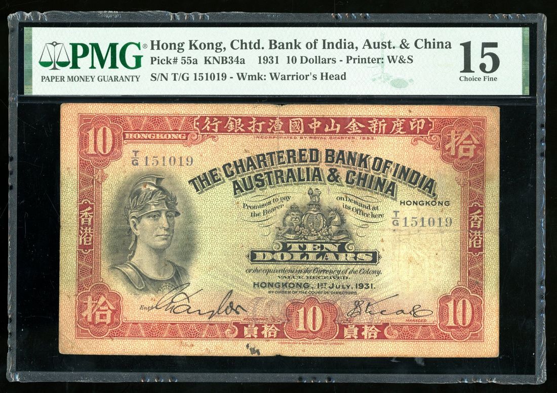 Chartered Bank of India, Australia & China, Hong Kong, $10, 1.7.1931, serial number T/G 151019, one handsigned signature,