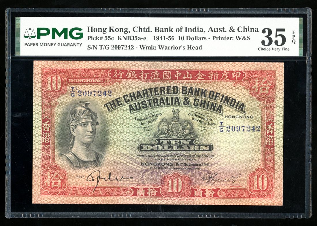 Chartered Bank of India, Australia & China, Hong Kong, $10, 18.11.1941, serial number T/G 20972422, (Pick 55c), PMG 35EPQ. Original example