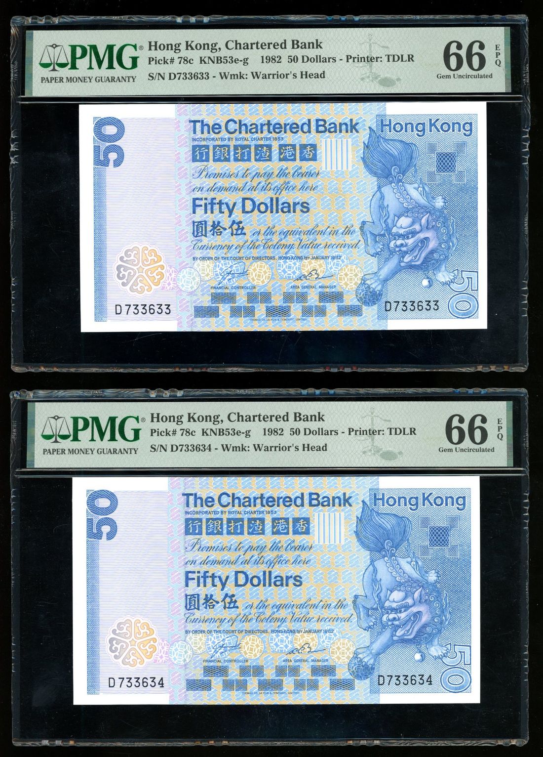 Chartered Bank, Hong Kong, a consecutive pair of $50, 1.1.1982, serial number D733633-34, blue on multicolour underprint, lion at right,