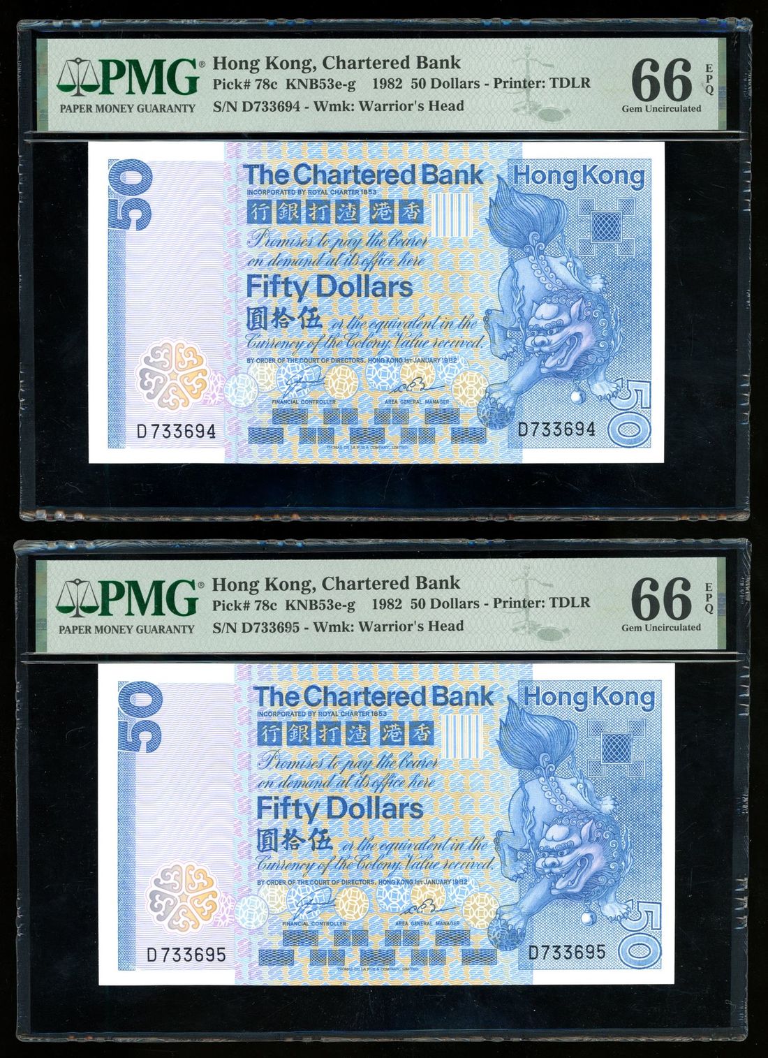 Chartered Bank, Hong Kong, a consecutive pair of $50, 1.1.1982, serial number D733694-95, blue on multicolour underprint, lion at right,