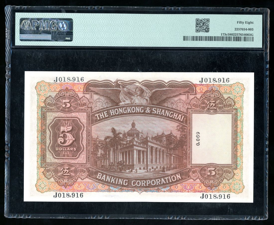 Hongkong & Shanghai Banking Corporation, $5, DURESS NOTE, 1.4.1940, serial number J 018916, vertical number 0069, brown and multicolour, reclining maiden at right,