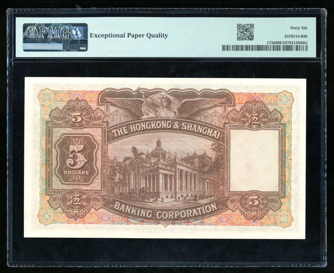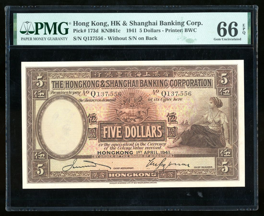 HongKong & Shanghai Banking Corporation, $5, 1.4.1941, serial number Q137556, (Pick 173d), PMG 66EPQ