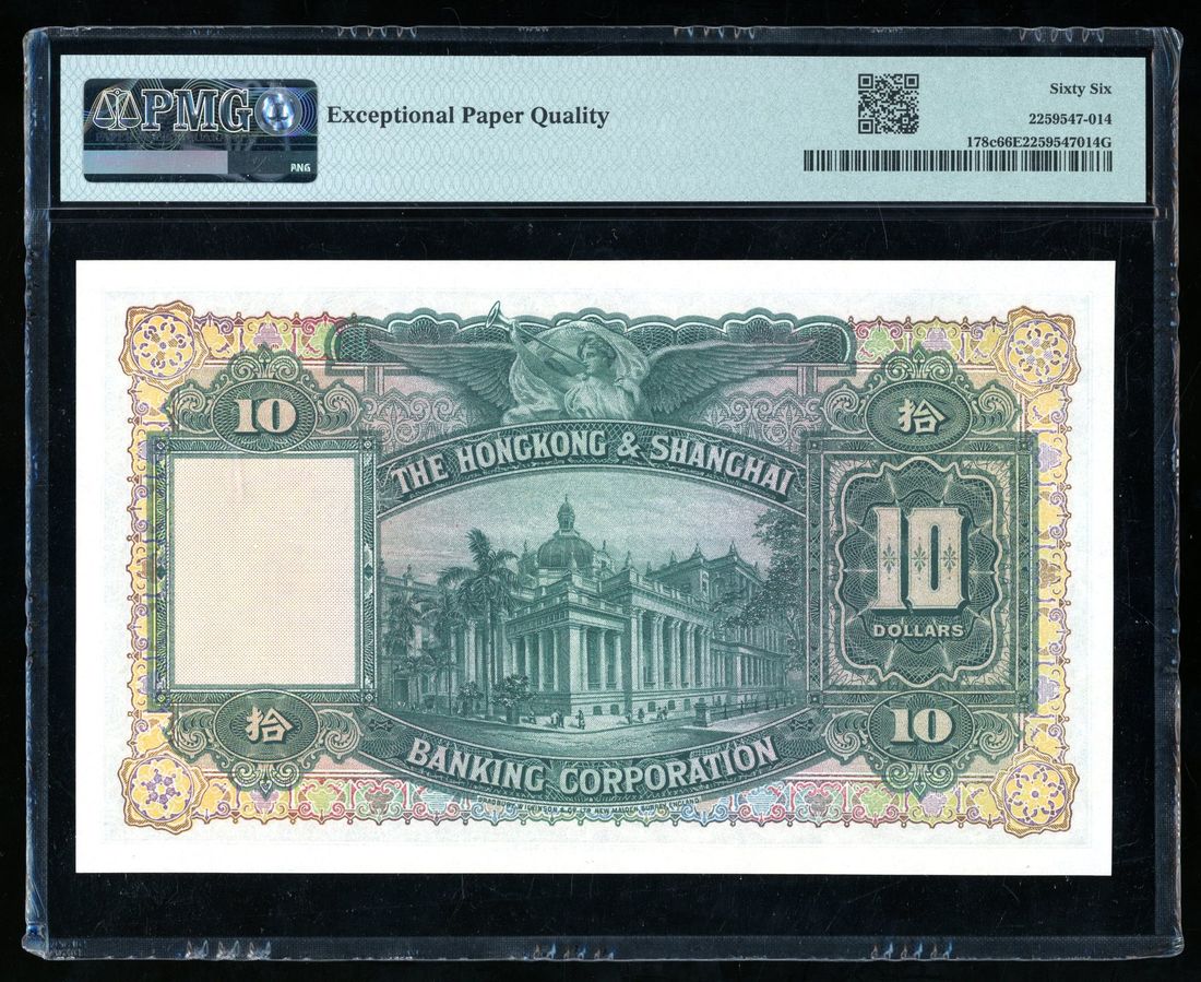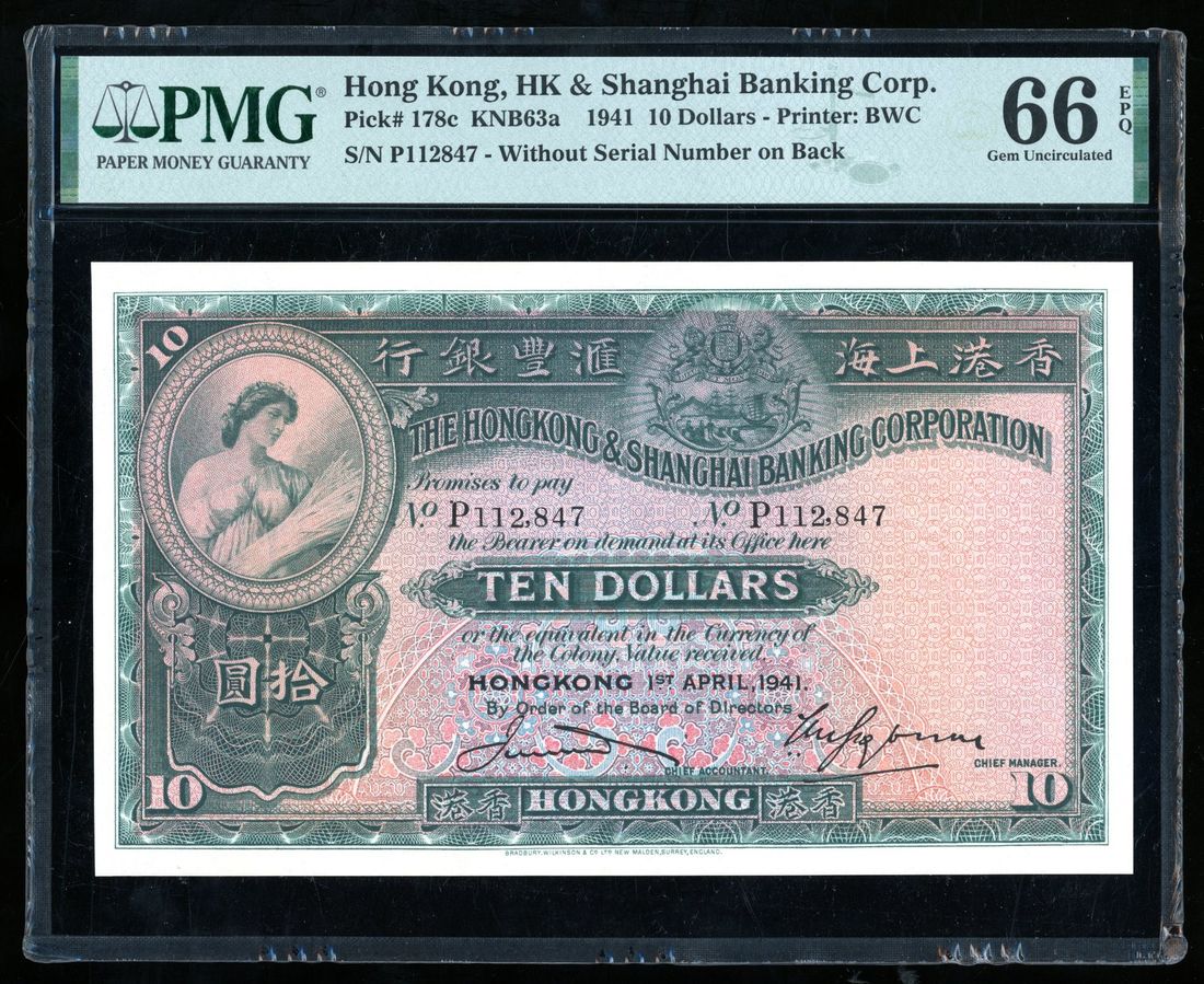 Hong Kong and Shanghai Banking Corporation, $10, 1.4.1941, serial number P112847, (Pick 178c), PMG 66EPQ.